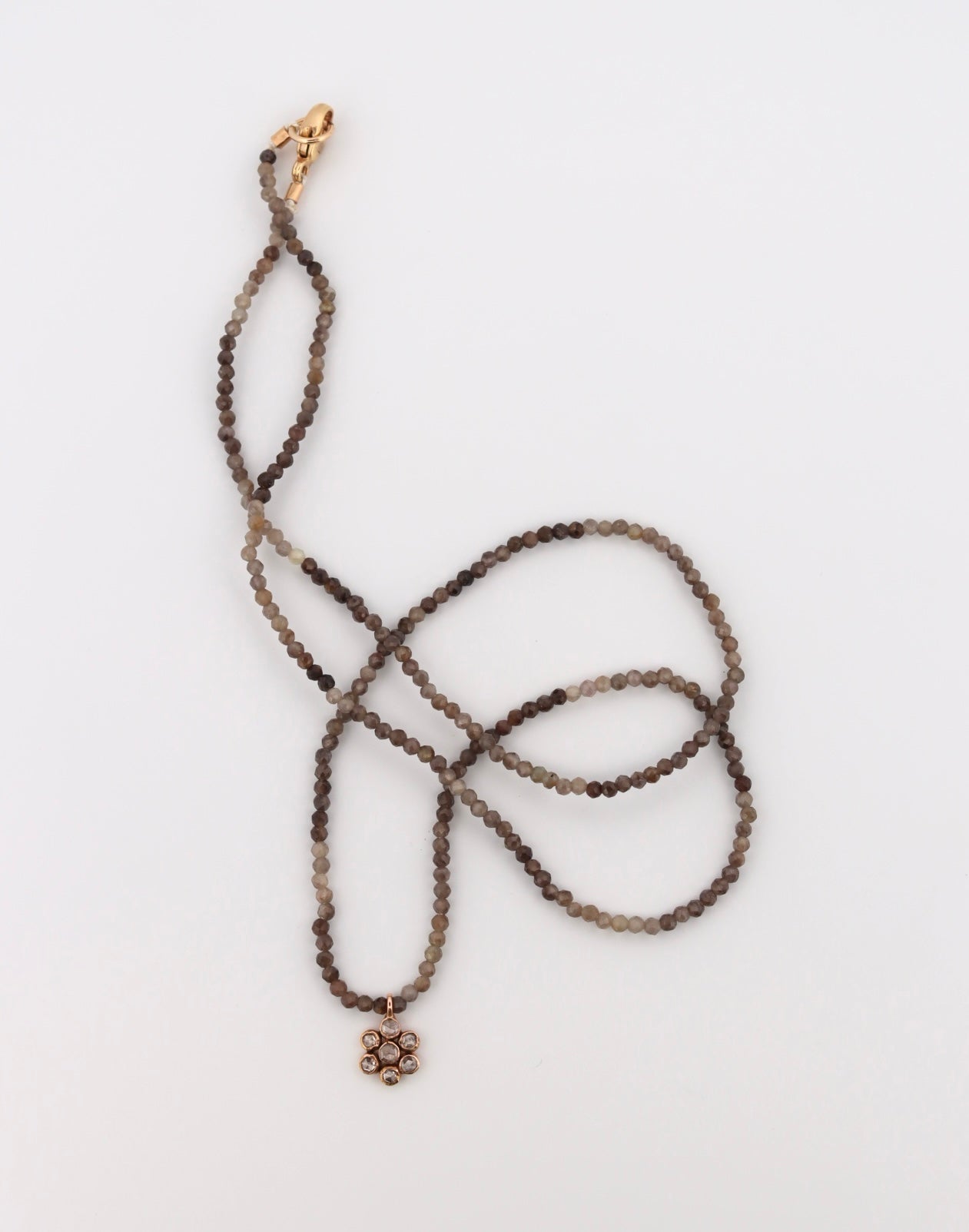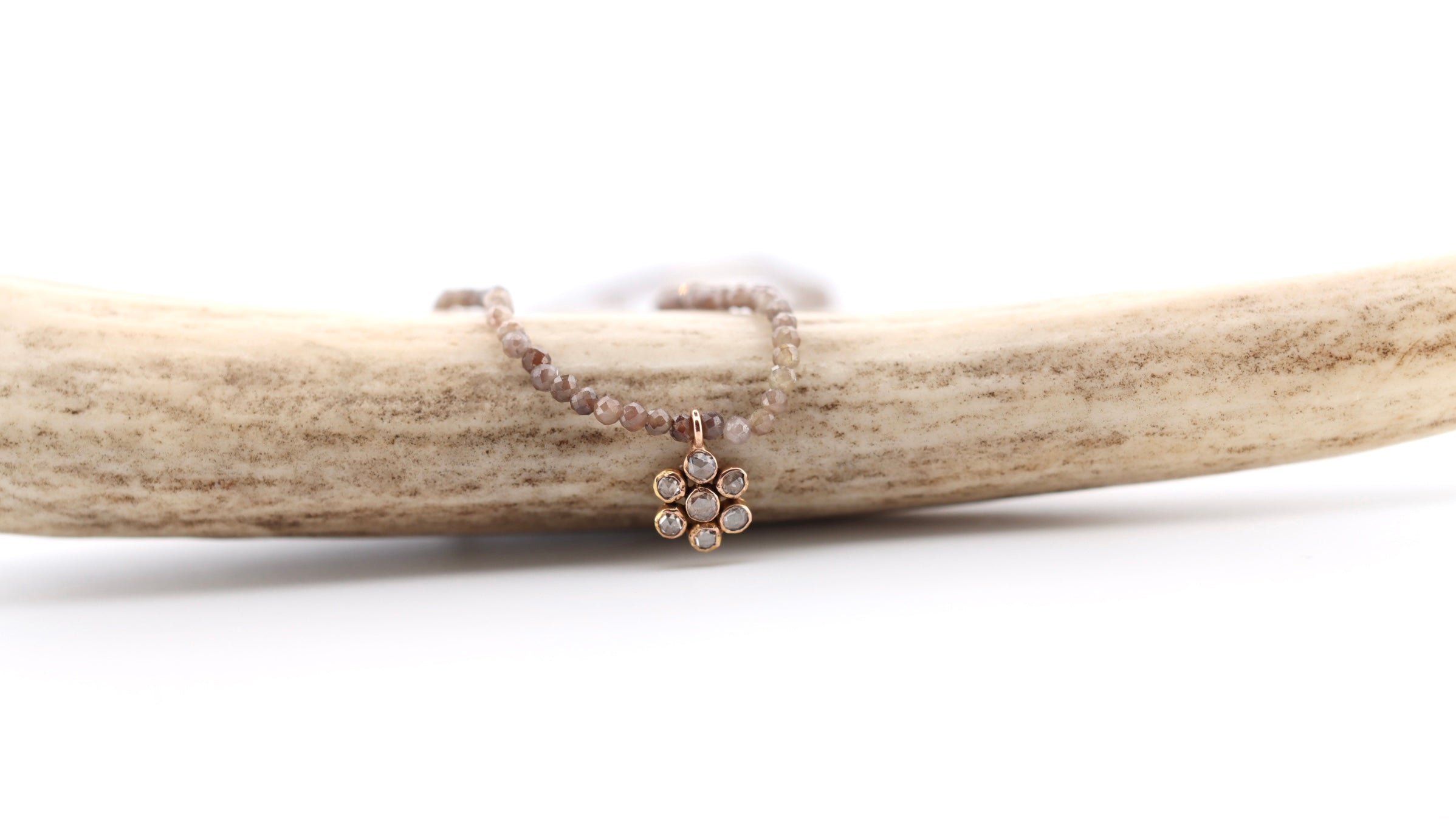 Micro faceted smoky quartz beads with 14k rose gold diamond flower charm