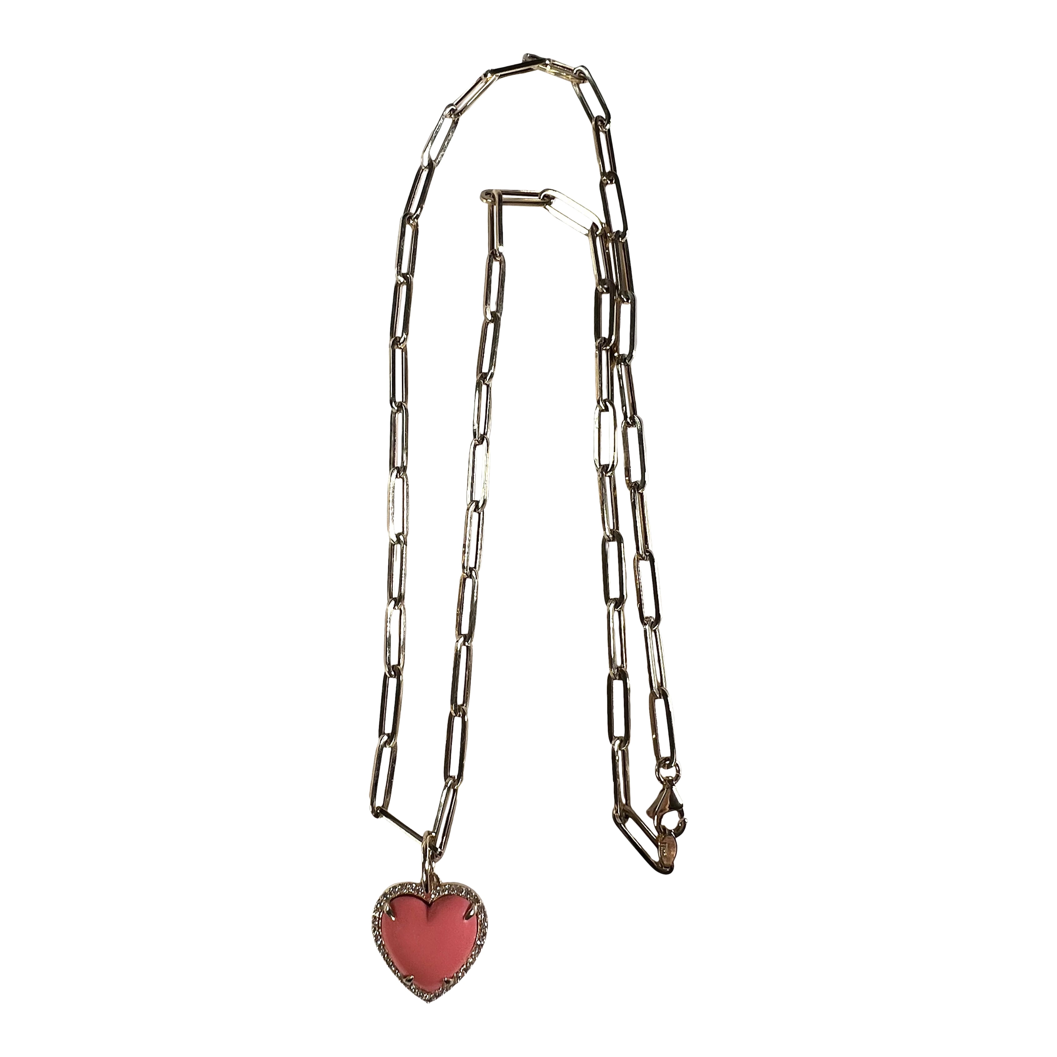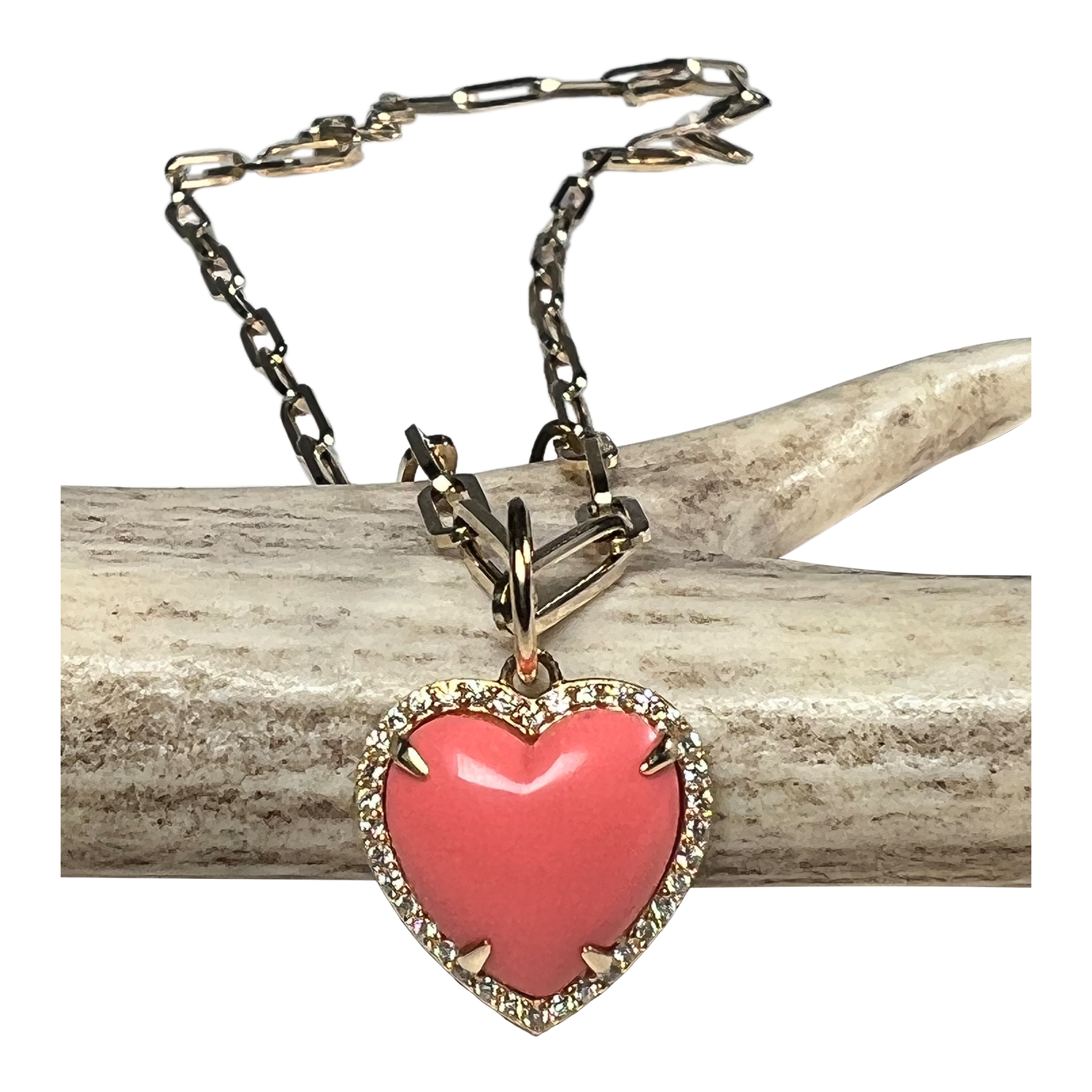 14k Yellow gold paper clip chain w/ 14k YG coral & white diamond heart pendant