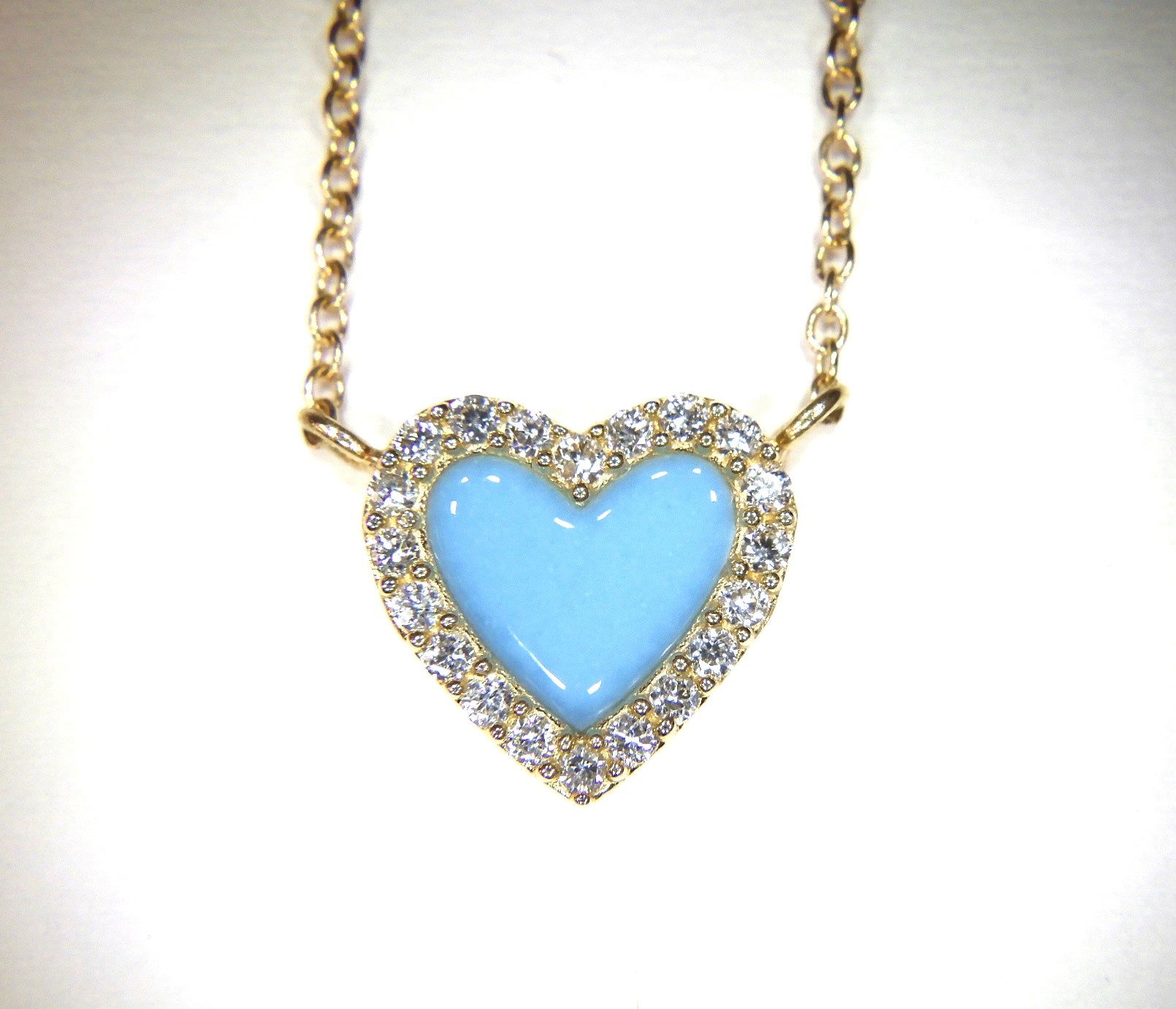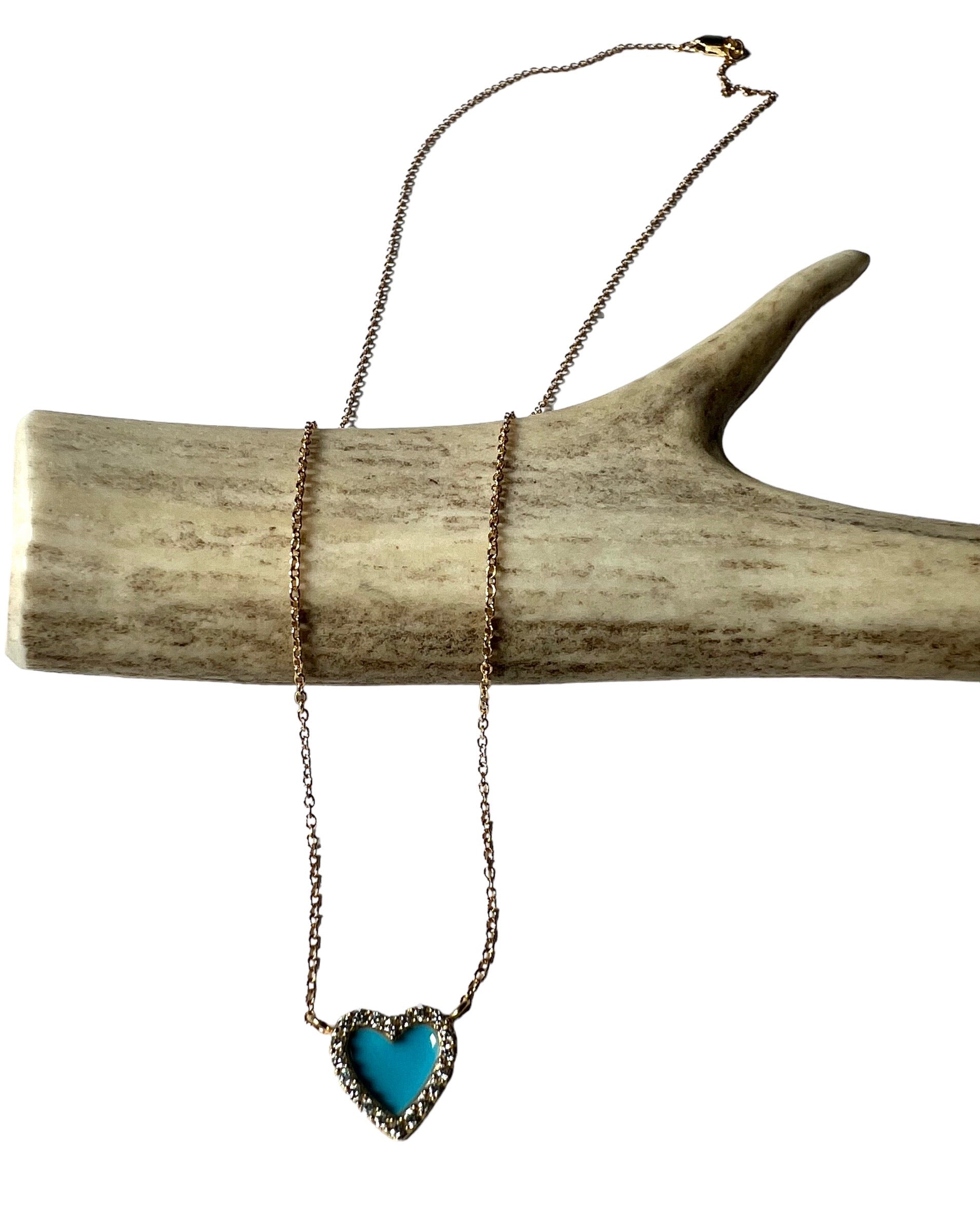 14k yellow gold turquoise inlay and white diamond small heart necklace