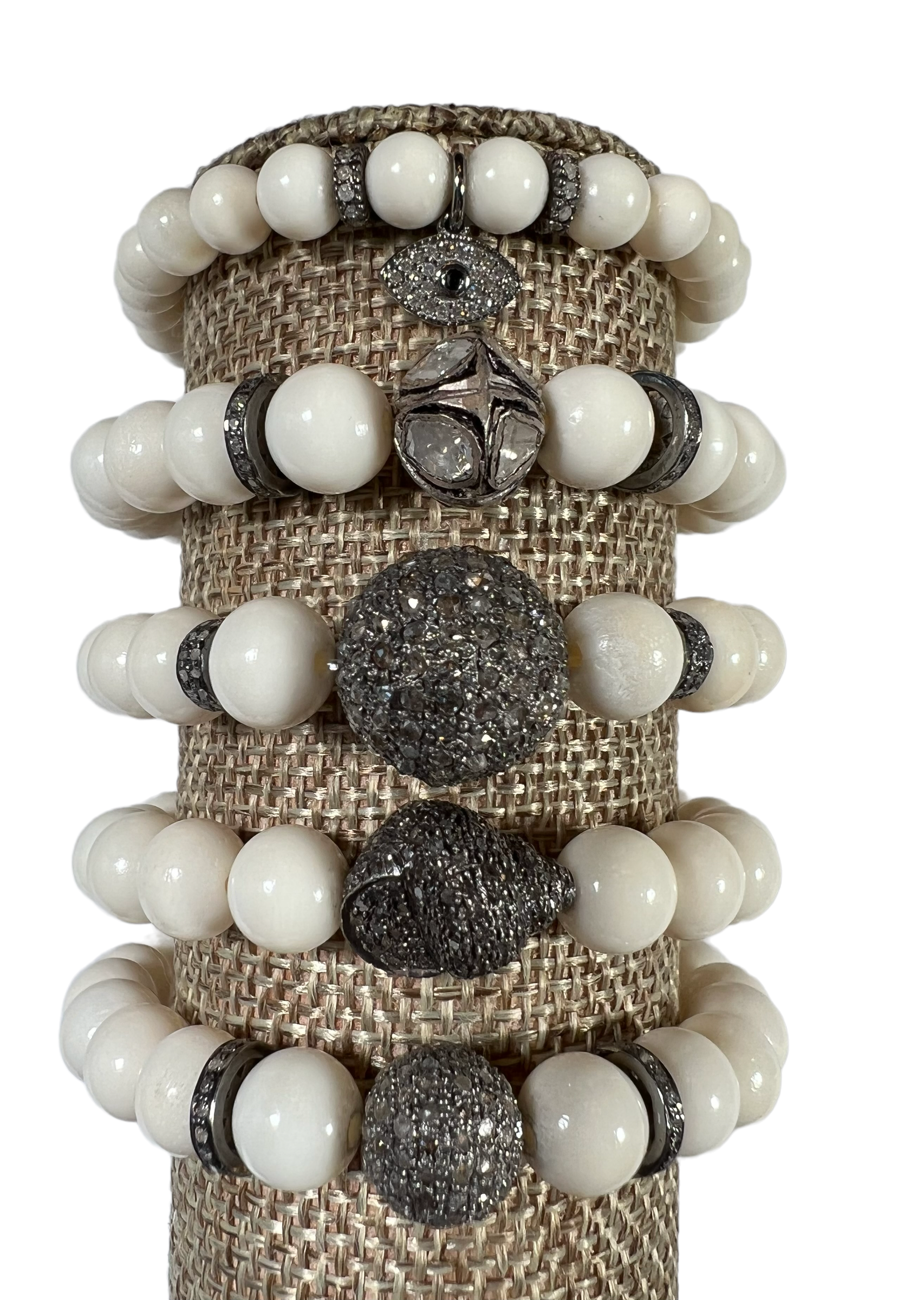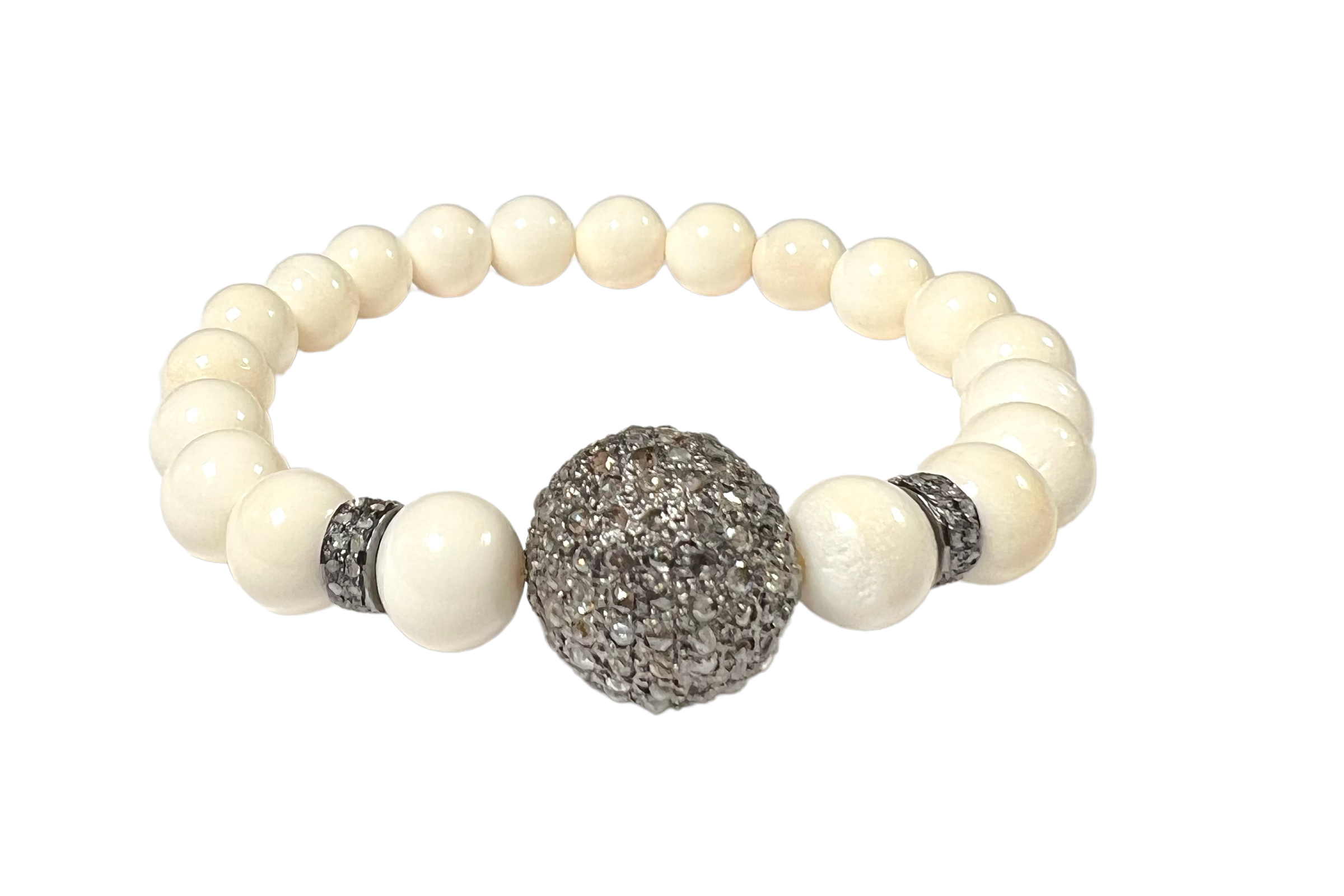 Smooth round bone beads with large oxidized sterling silver white diamond pave round bead and double row diamond spacer beads - stretchy bracelet