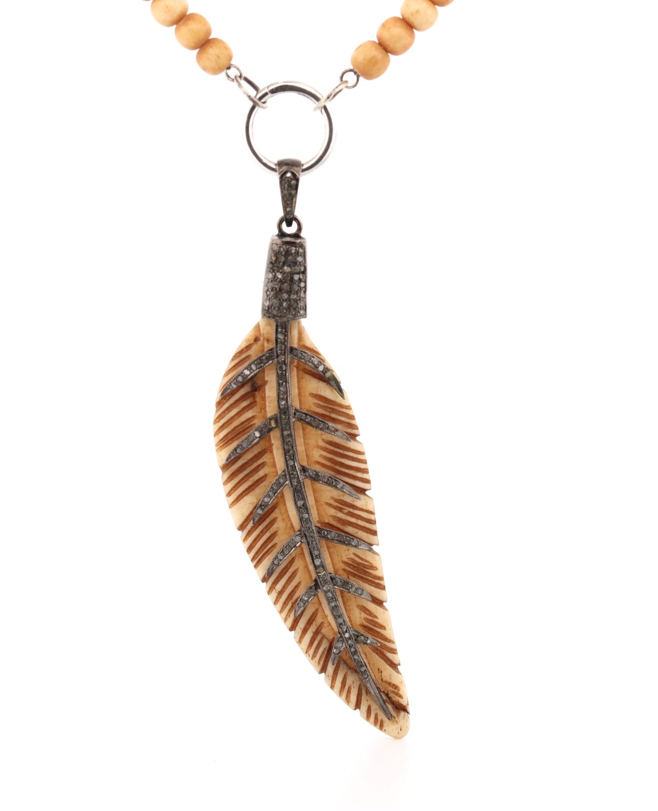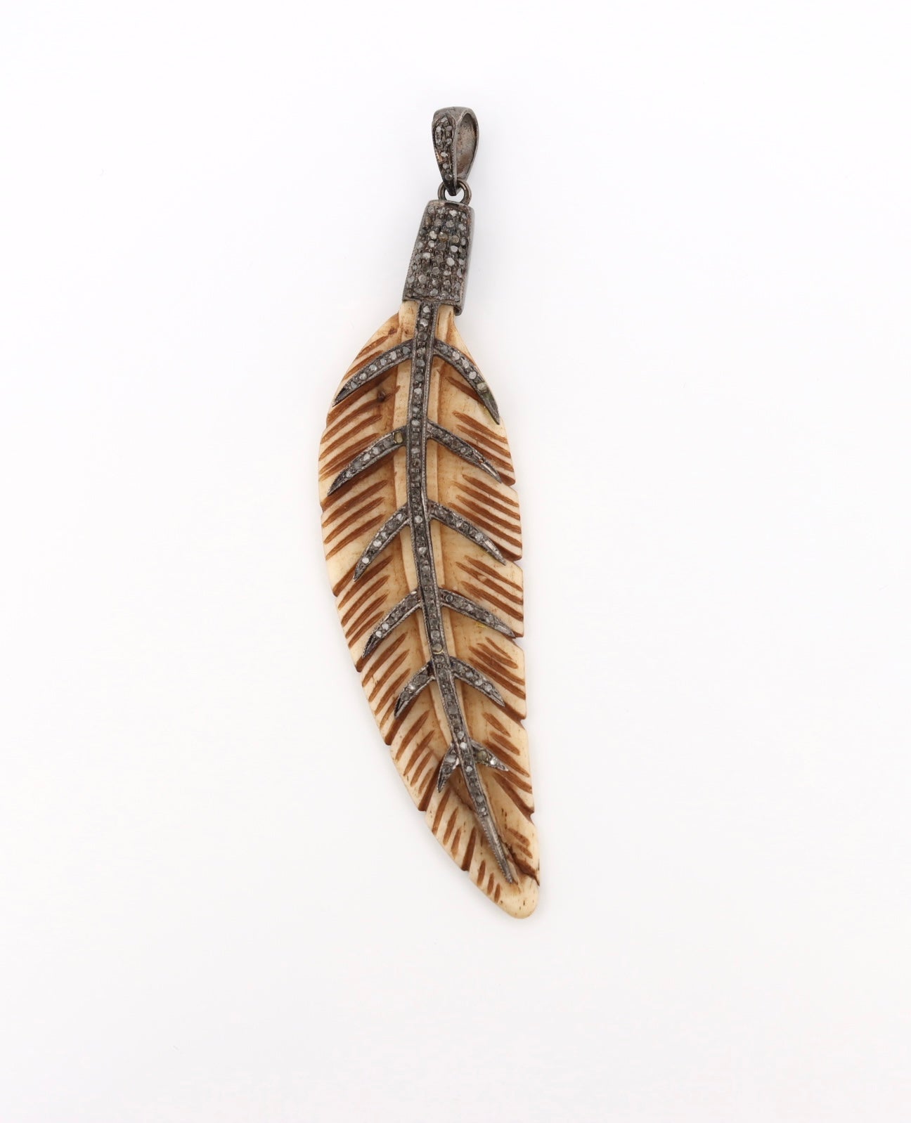 Carved bone feather with oxidized pave diamond silver vein pendant