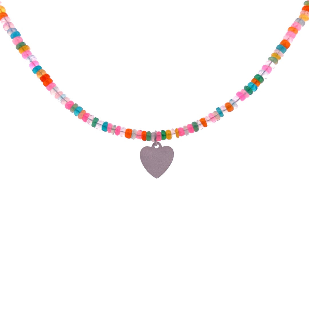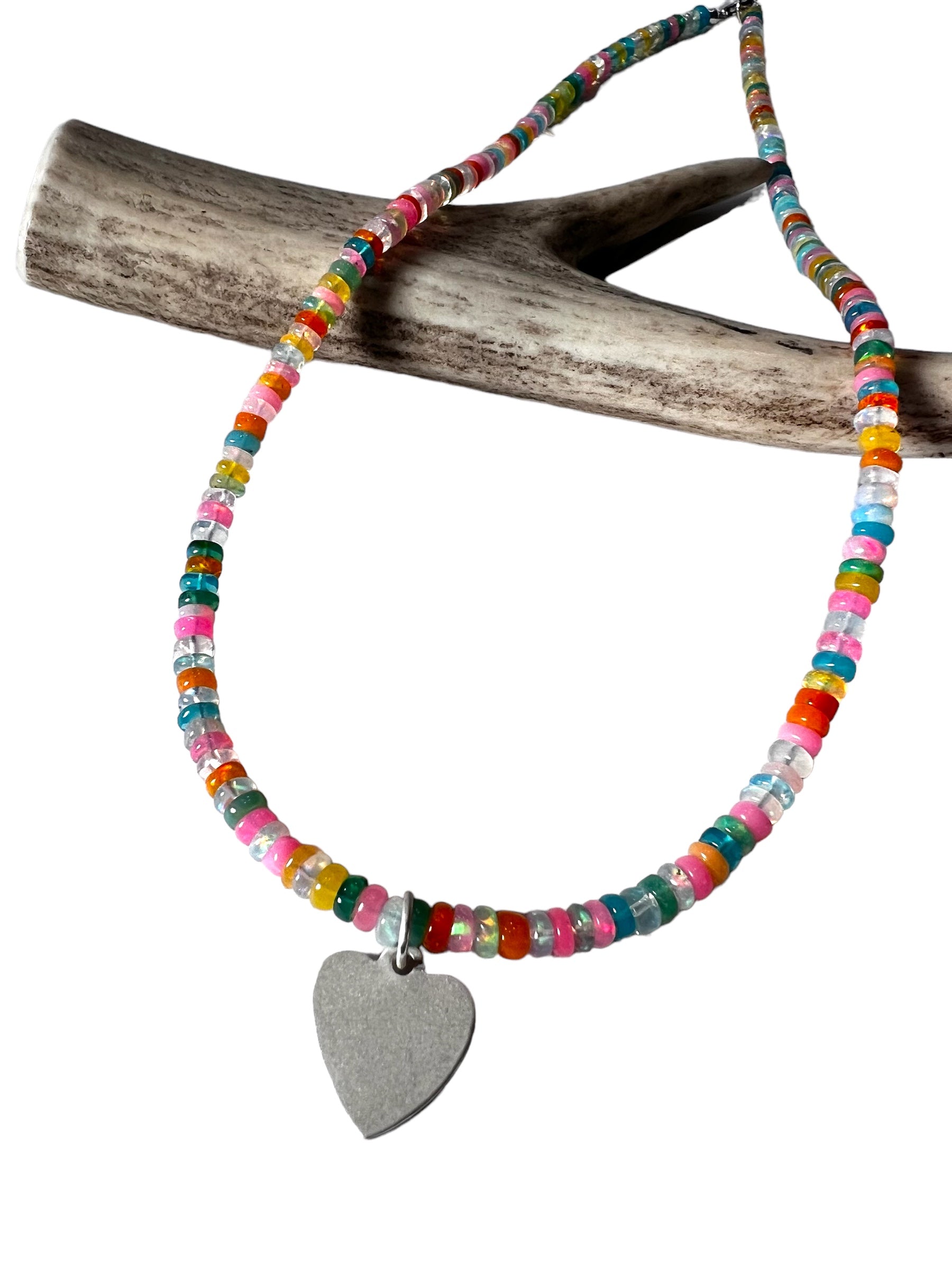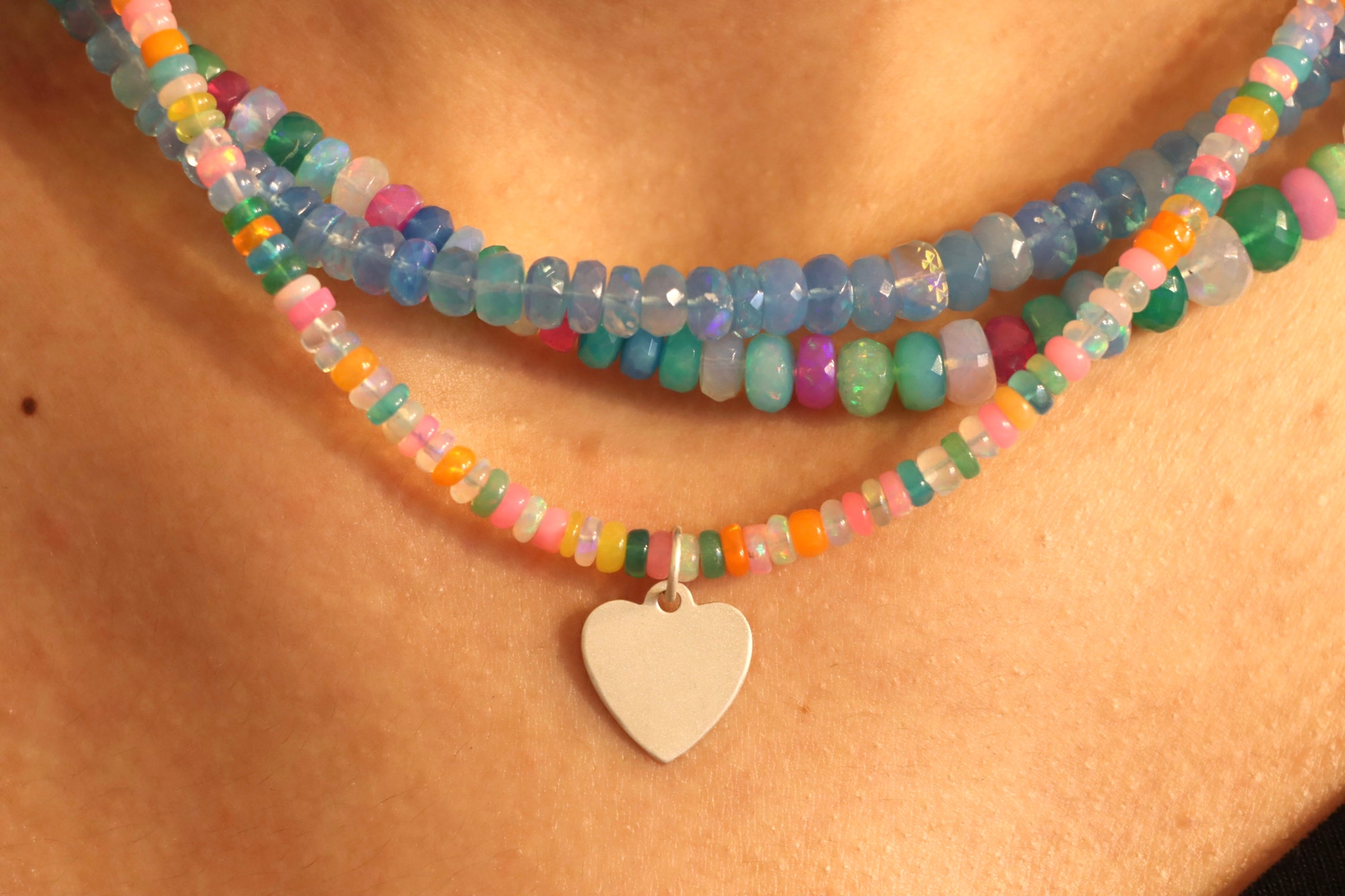 Bright smooth disc opal roundel beads with matte sterling silver flat heart pendant and sterling silver clasp