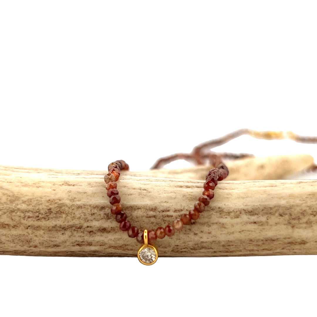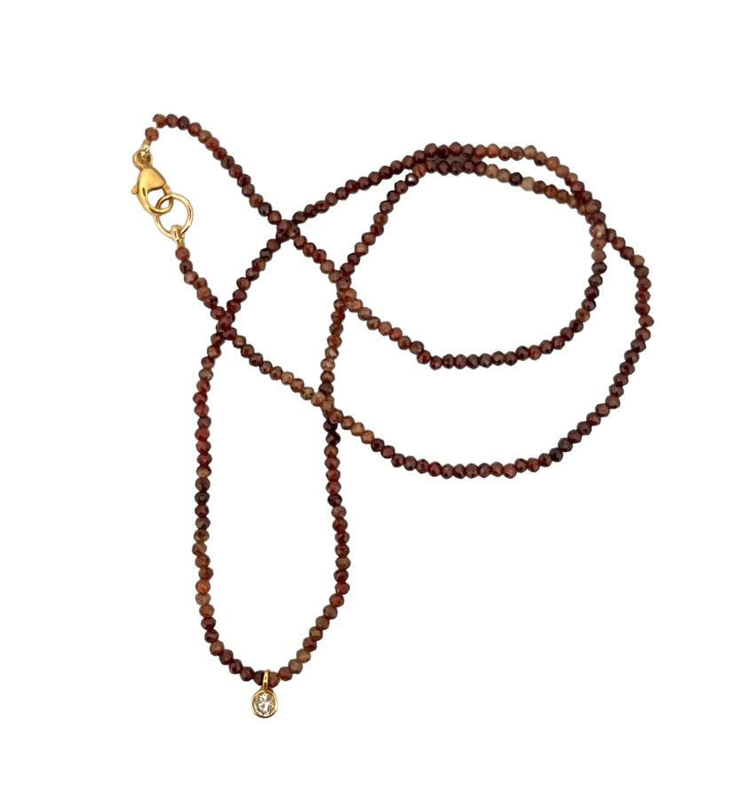 Micro faceted round brown sapphires with 14k yellow gold and white diamond drop pendant