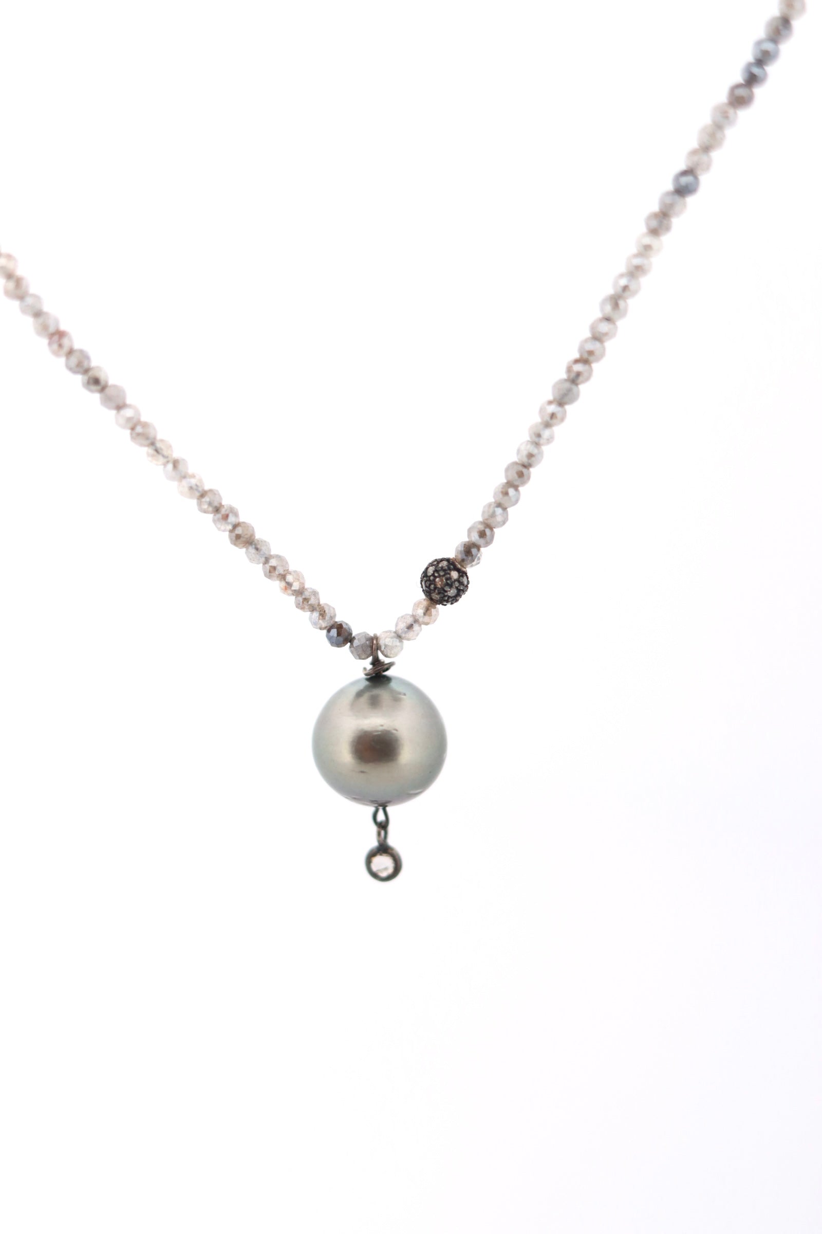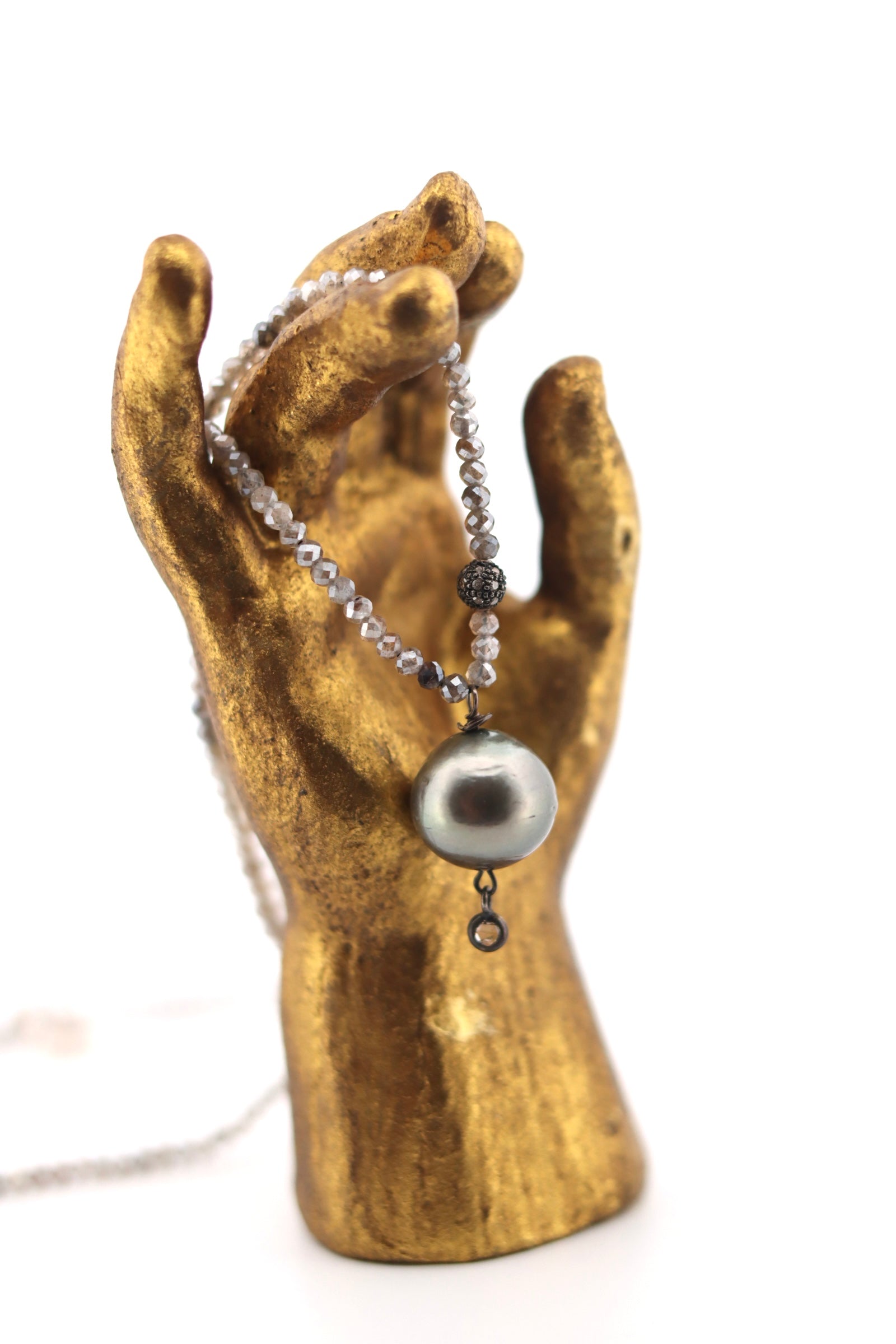 Facetted coated labradorite with oxidized sterling silver pave diamond ball, Tahitian pearl and silver small diamond drop
