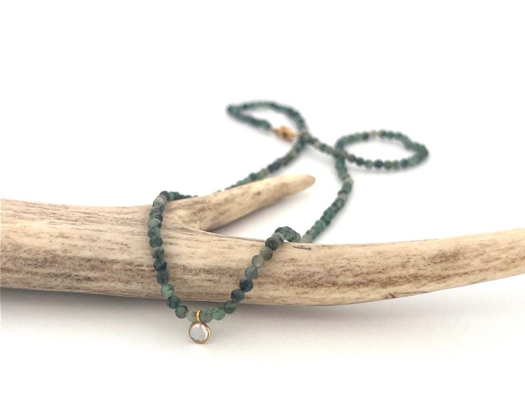 Round faceted multi hued green emeralds with 14k YG moonstone drop and gold filled lobster clasp