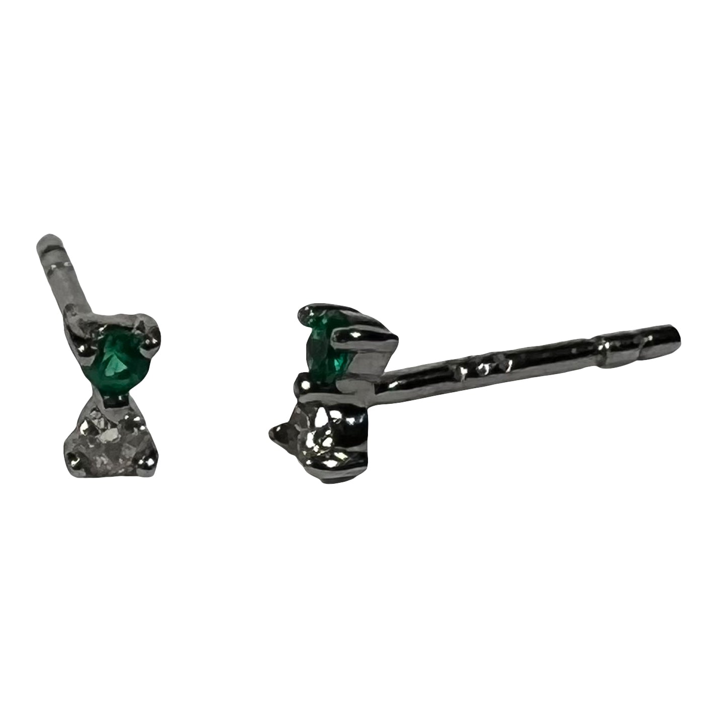 Oxidized Sterling Silver Emerald And White Diamond Tiny Studs 4.28mm Long
