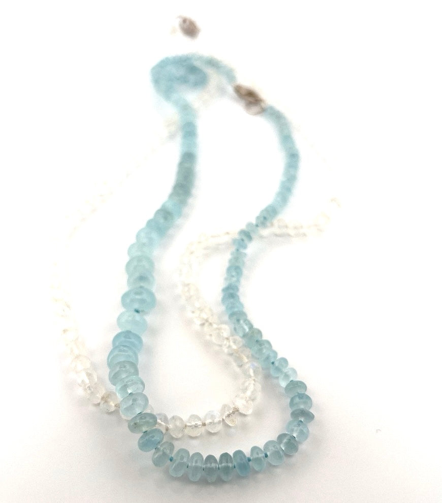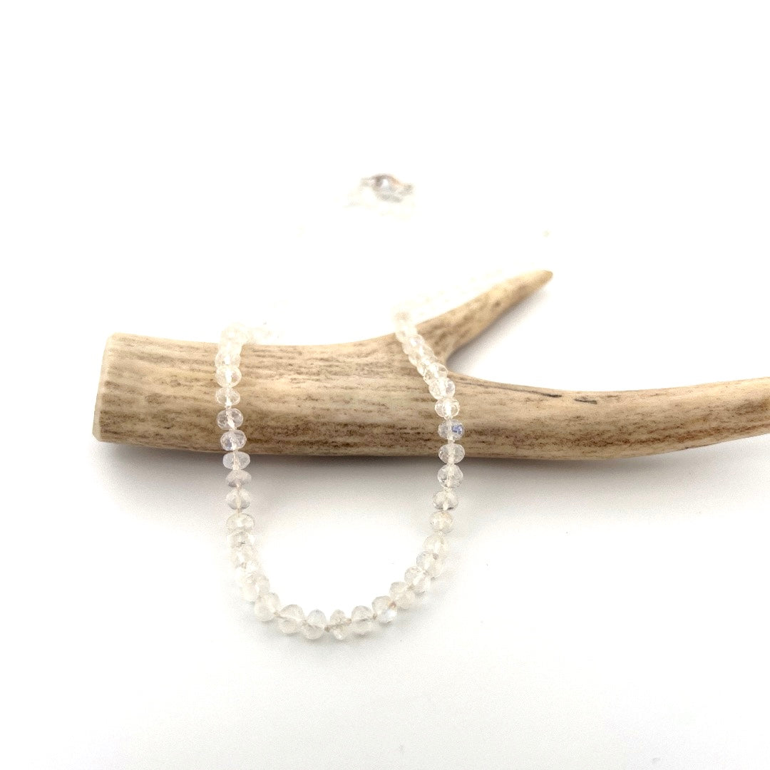 Faceted moonstone beads hand knotted on white silk with sterling silver clasp.