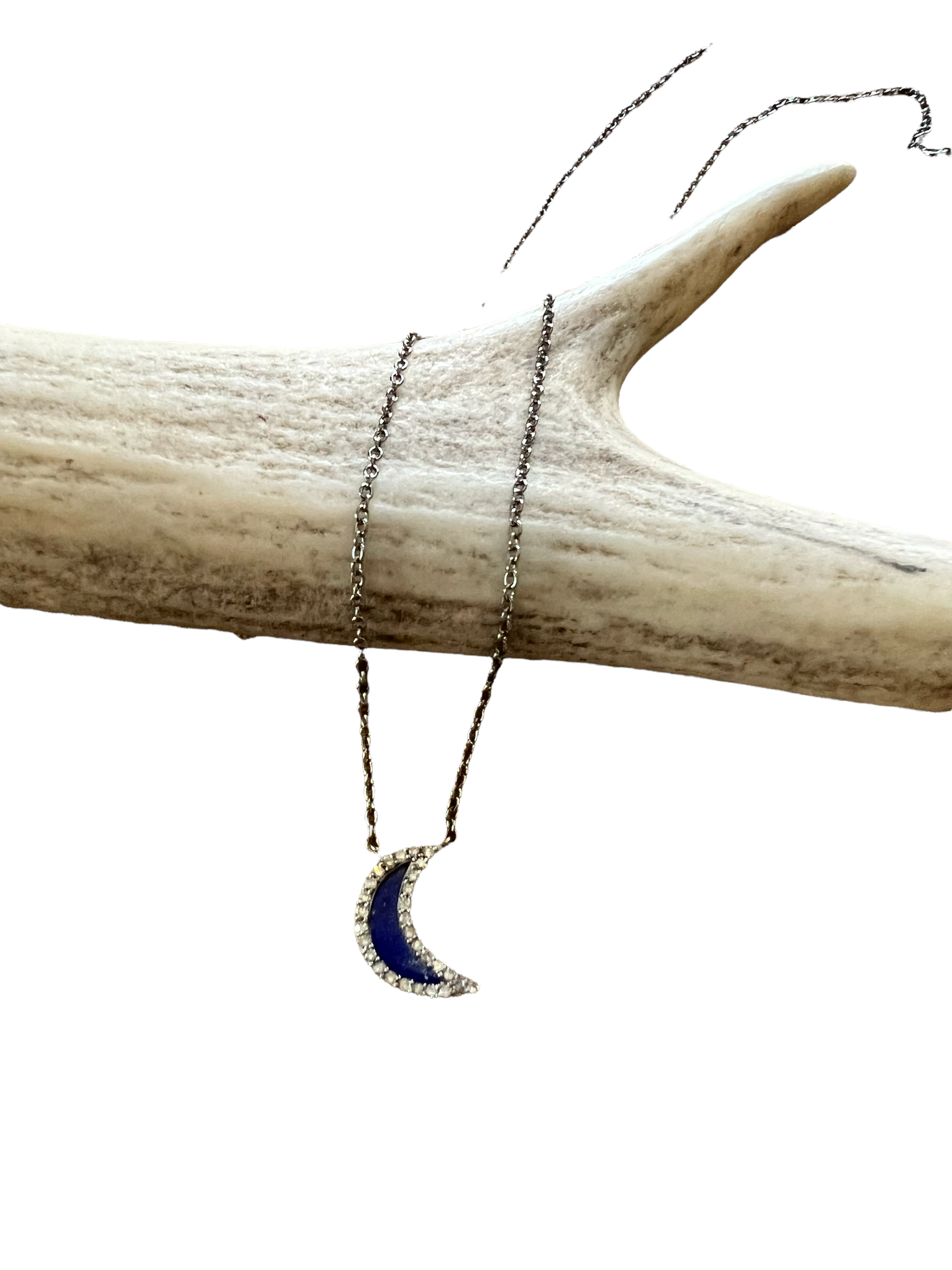 Oxidized sterling silver lapis and white diamond crescent moon necklace