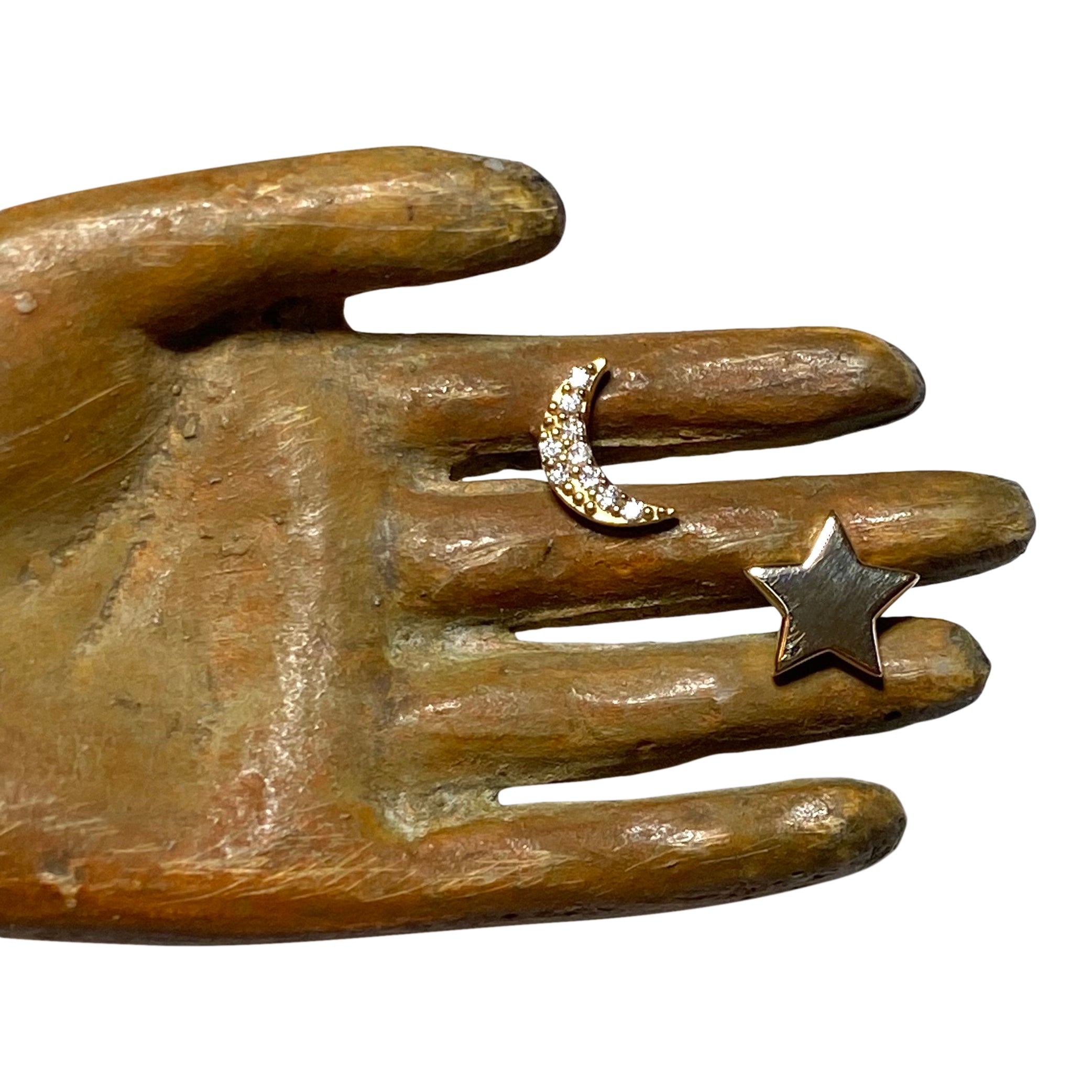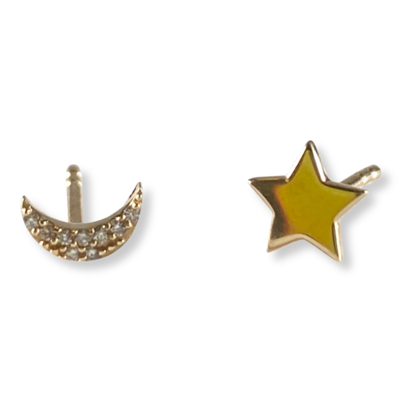 14k Yellow Gold With White Diamond Pave Crescent Moon And Plain 14k Yellow Gold Star Stud Earrings