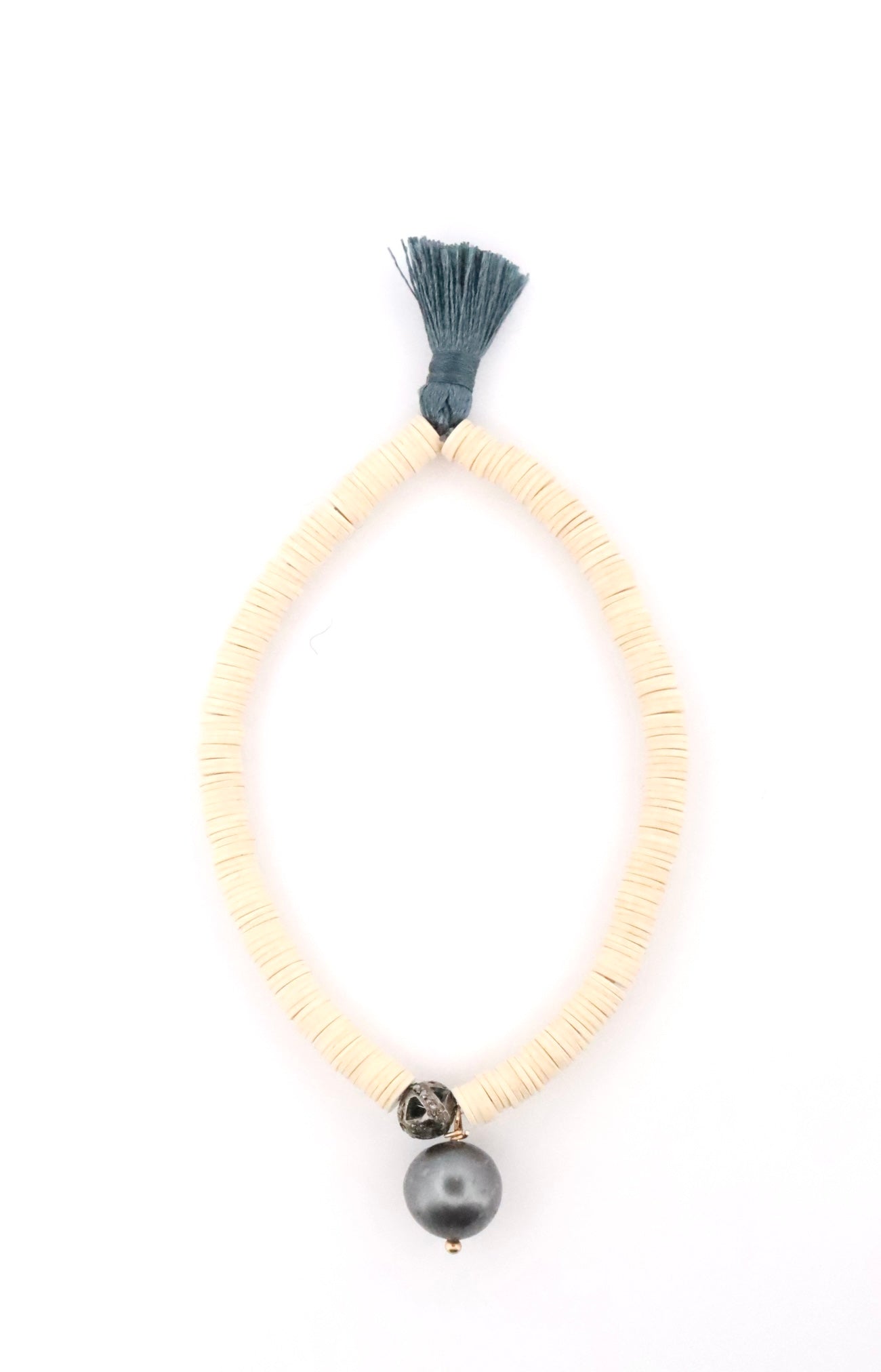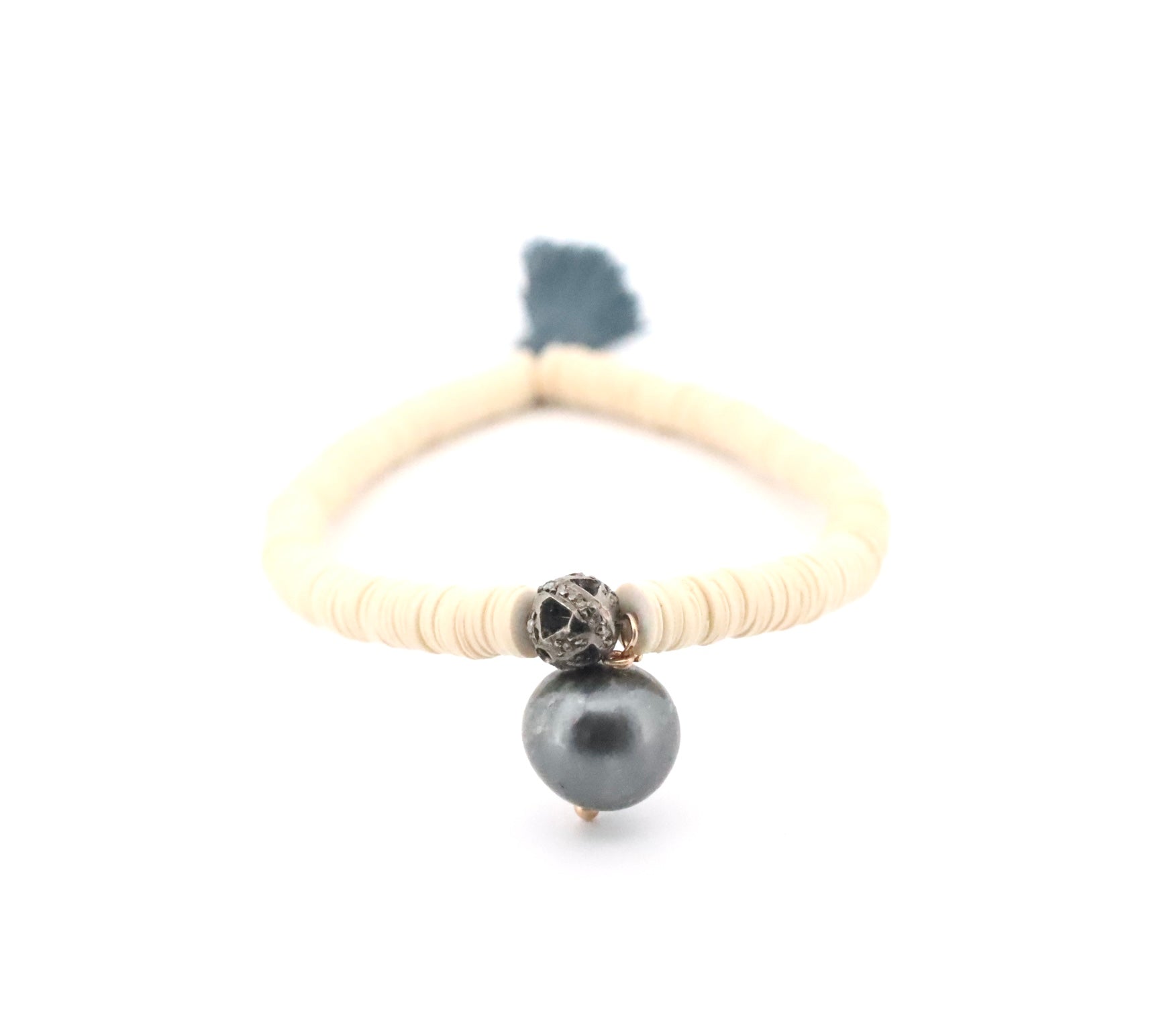 Vintage off white African vinyl beads with Tahitian pearl and oxidized diamond filigree spacer beads. Dark gray tassel. Strung on stretchy elastic