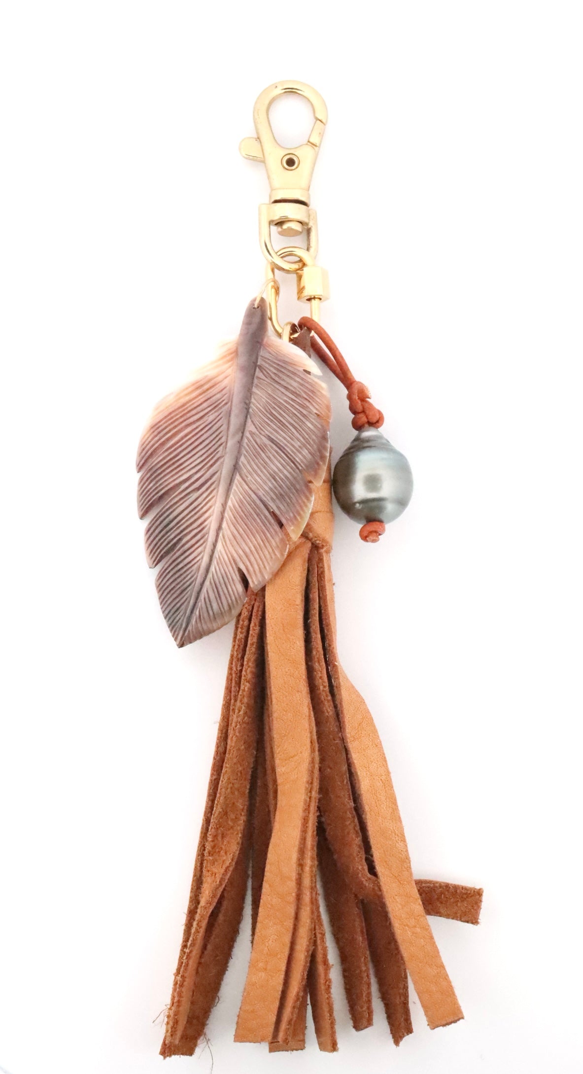 Mother of pearl carved leaf, leather tassel & Tahitian pearl on leather bag charm