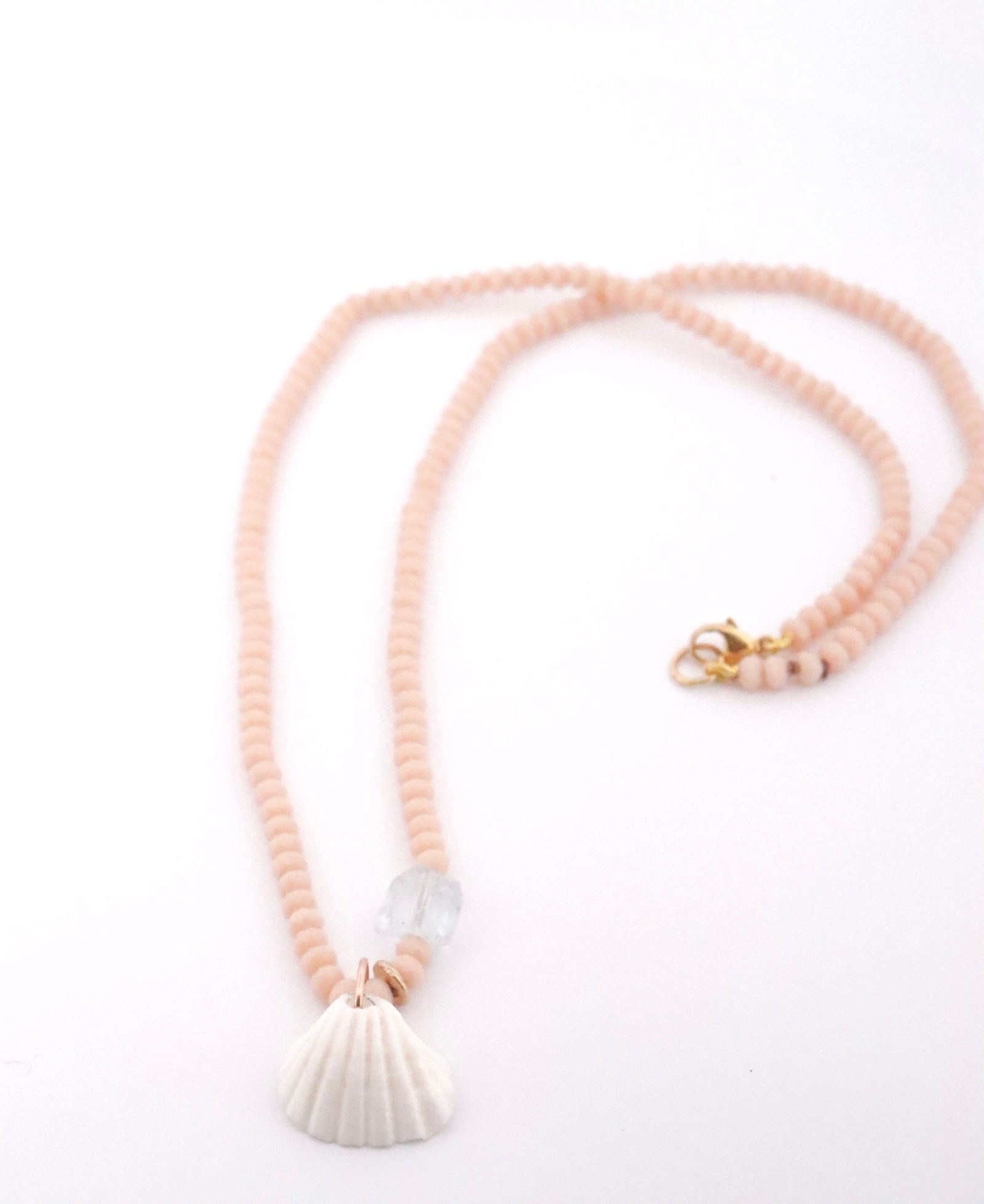 Faceted peach Opal with aquamarine nugget, hand casted 10k yellow gold bead and vintage African shell with gold filled loop and clasp