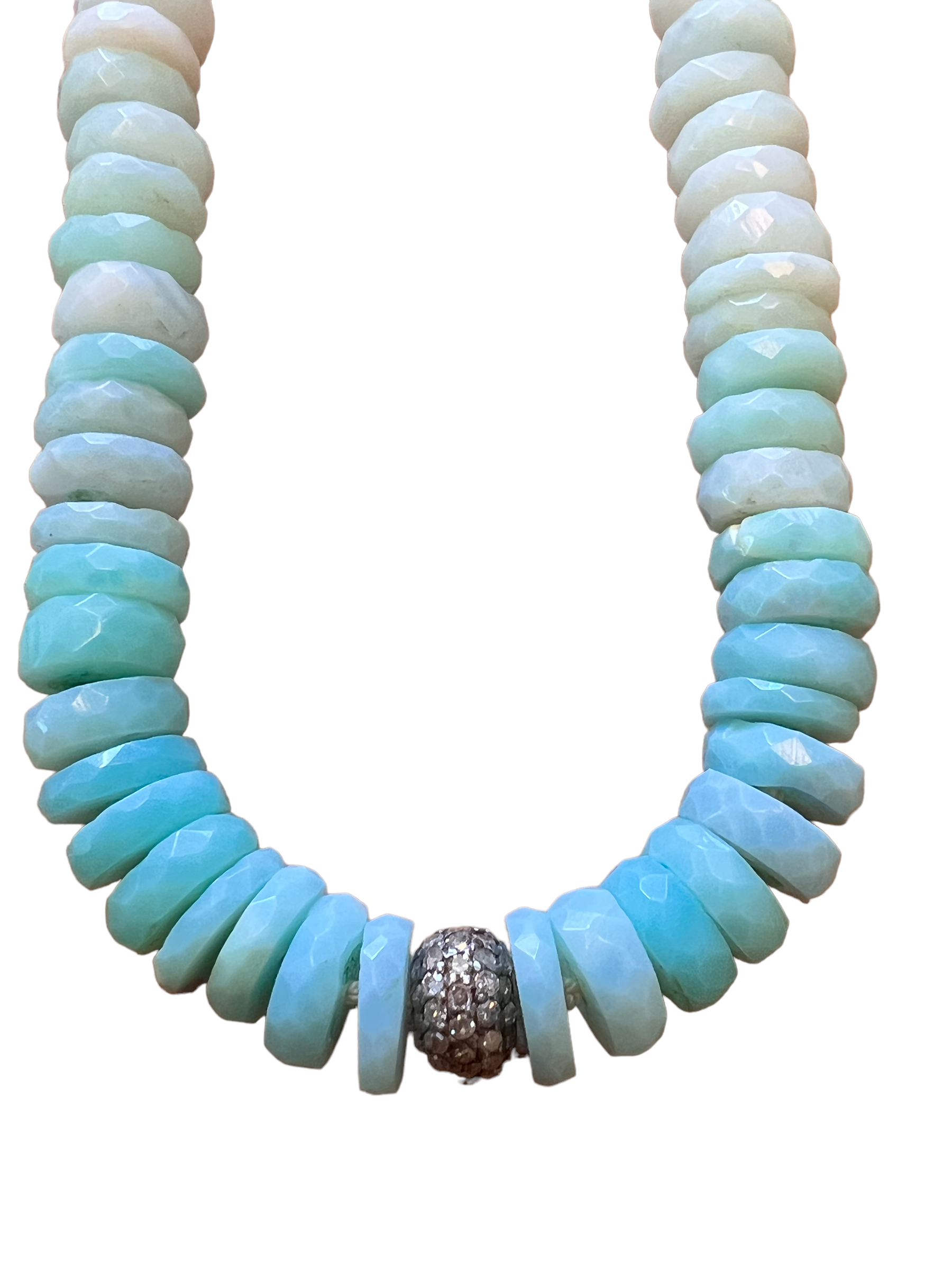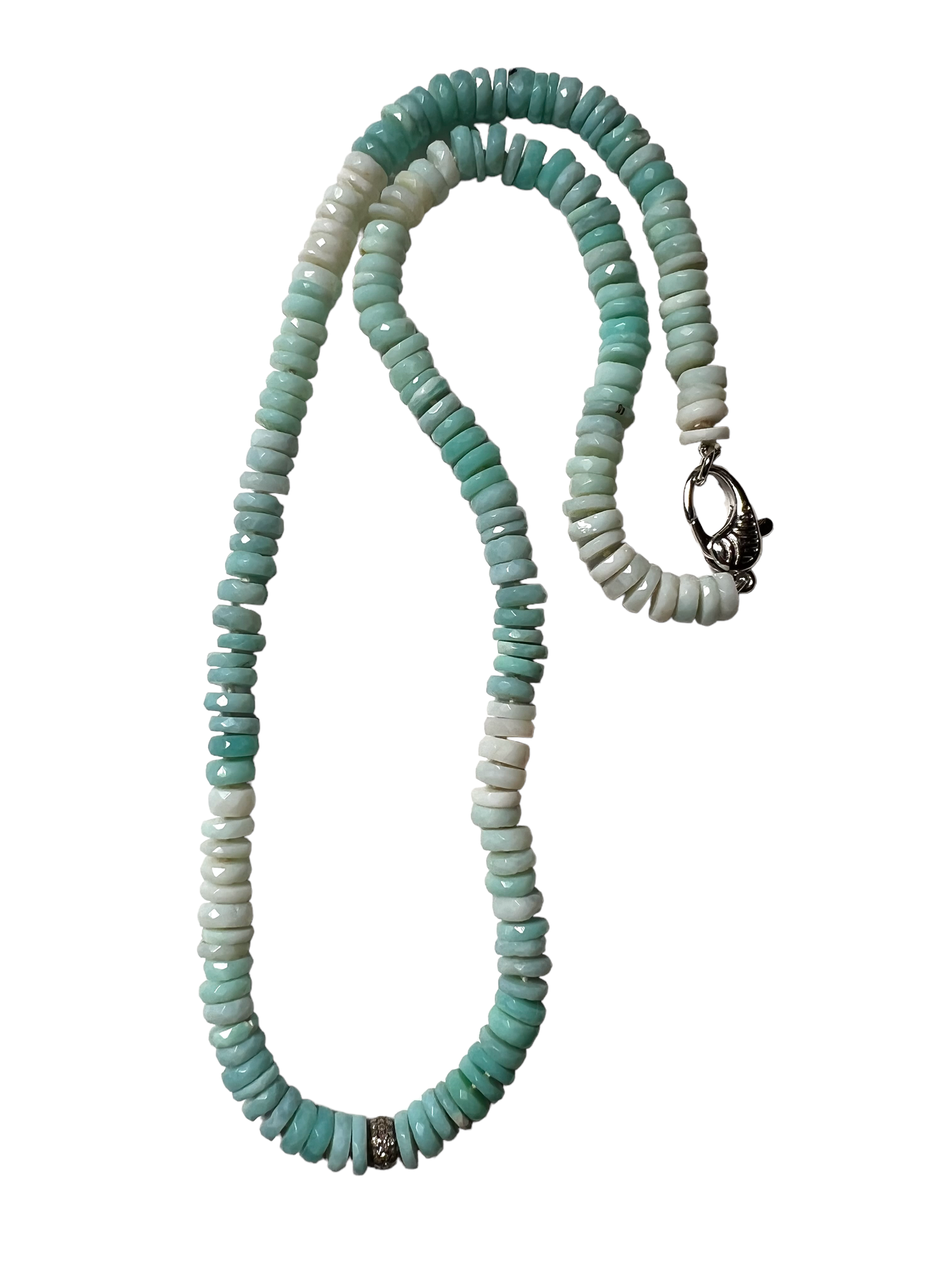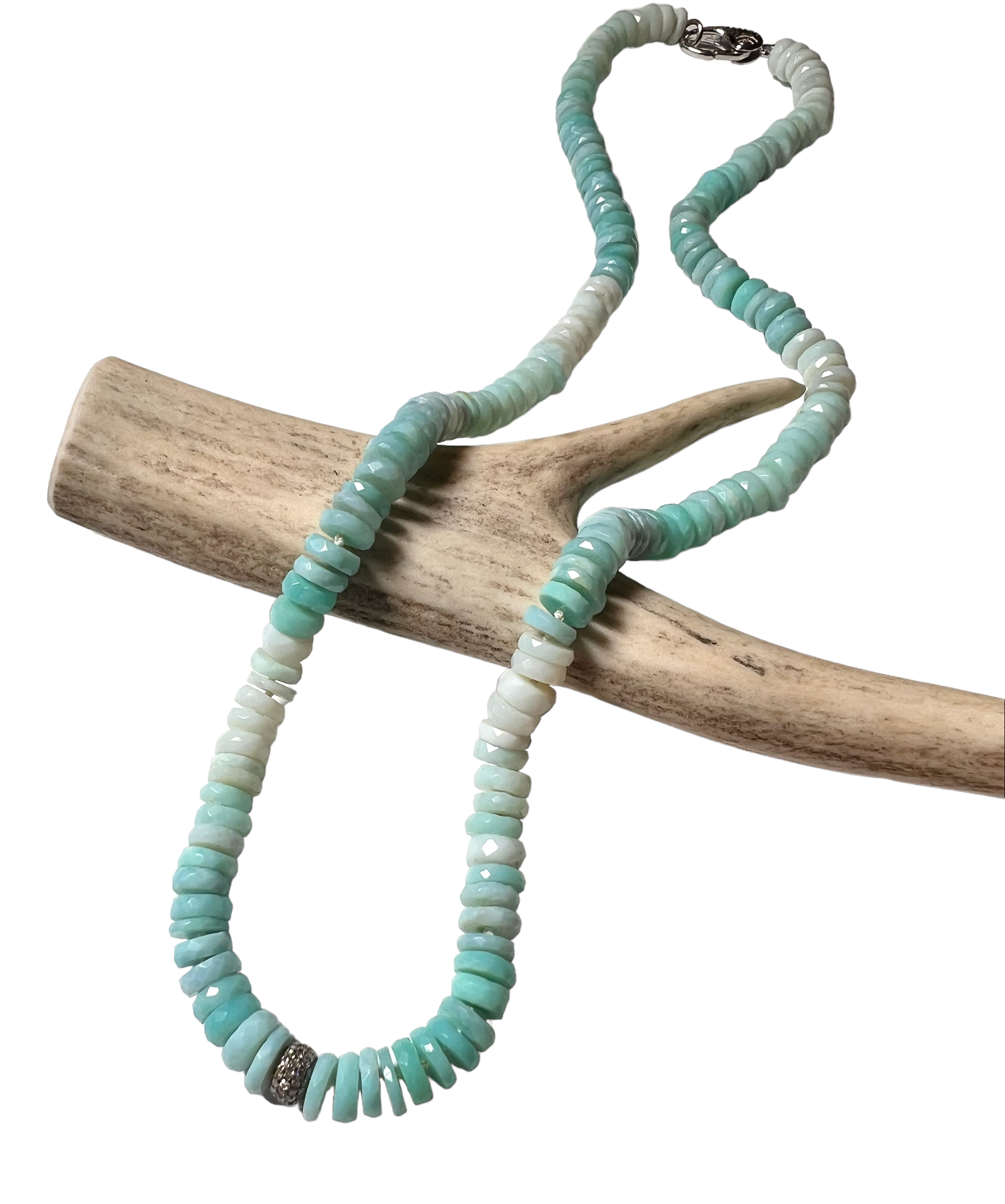 Faceted shaded Peruvian opal heishi necklace hand knotted on silk with pave white diamond spacer