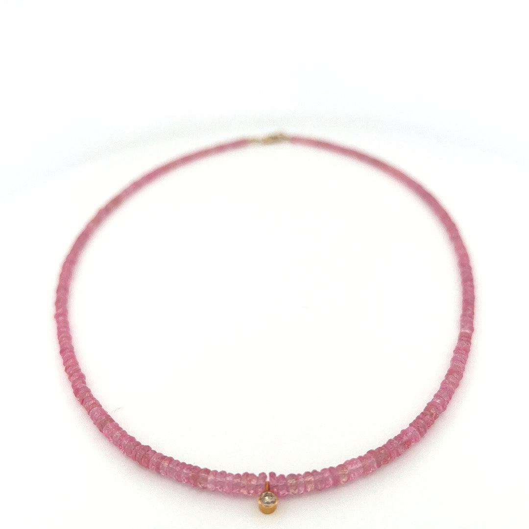 Faceted pink sapphire beads with 14k yellow gold white diamond drop and clasp