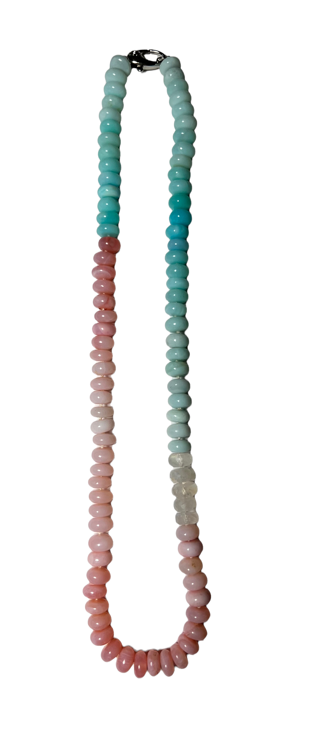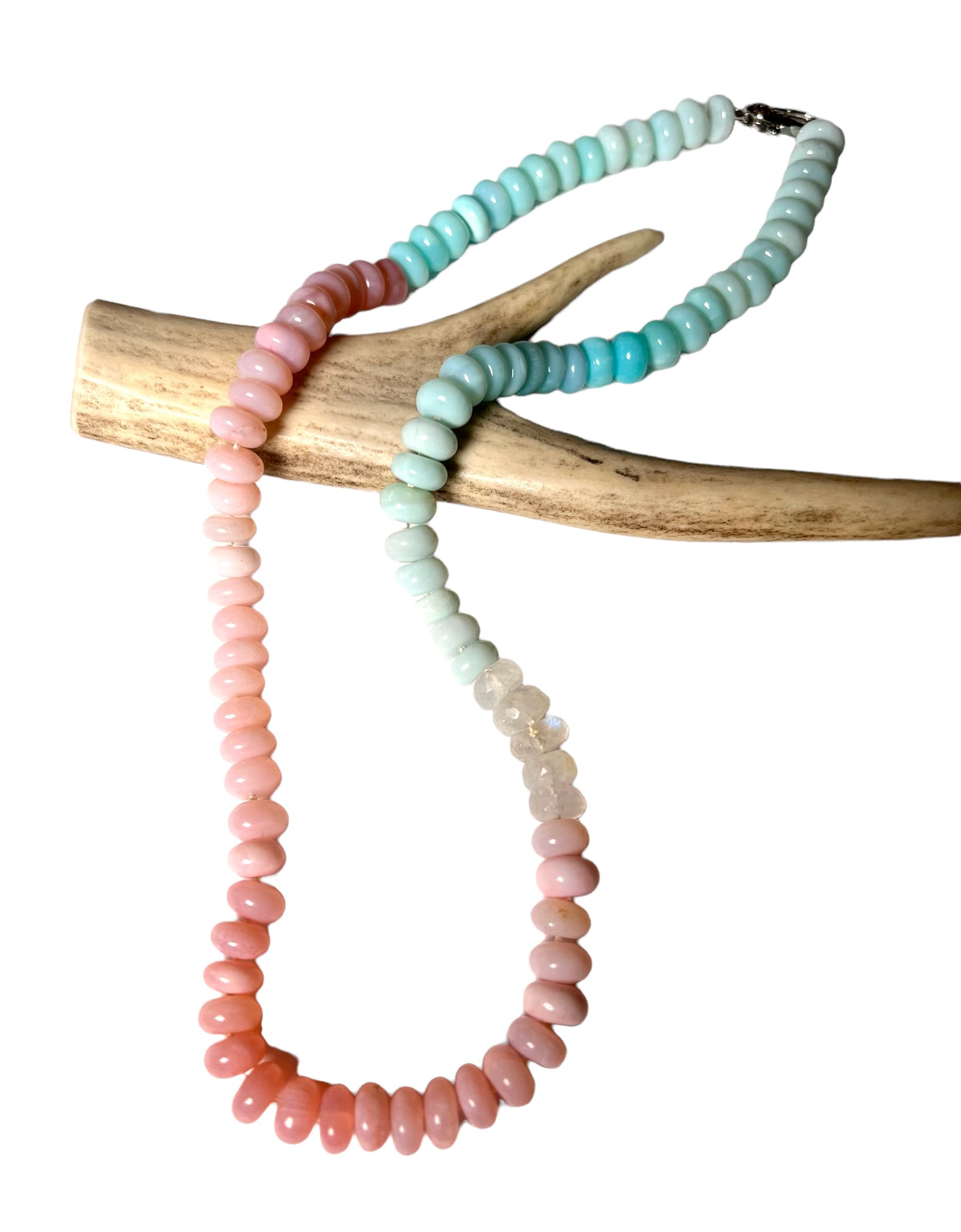 Shades of baby pink, sky blue opal and moonstone beads hand knotted on silk