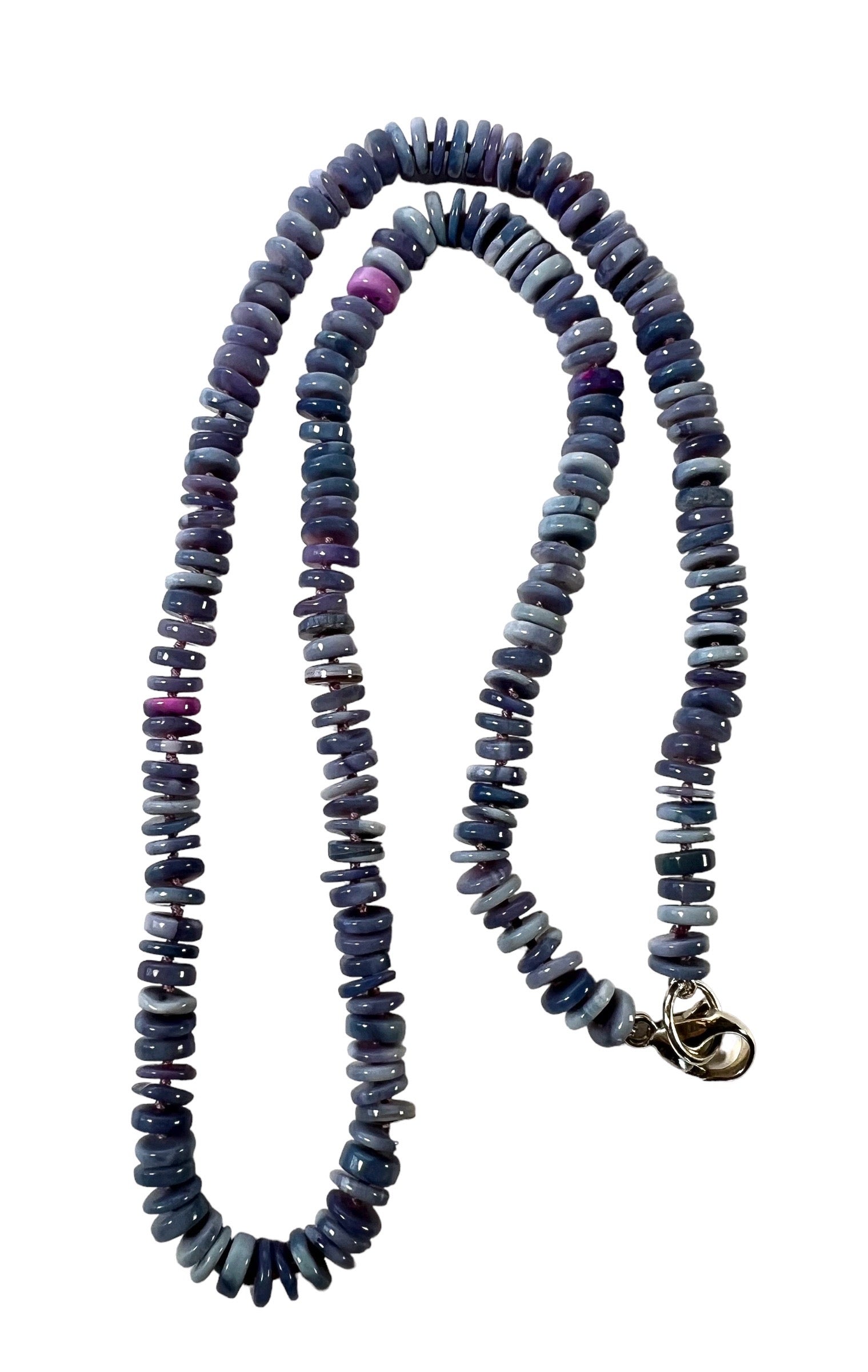 Dyed purple opal heishi necklace hand knotted on silk with sterling silver clasp.