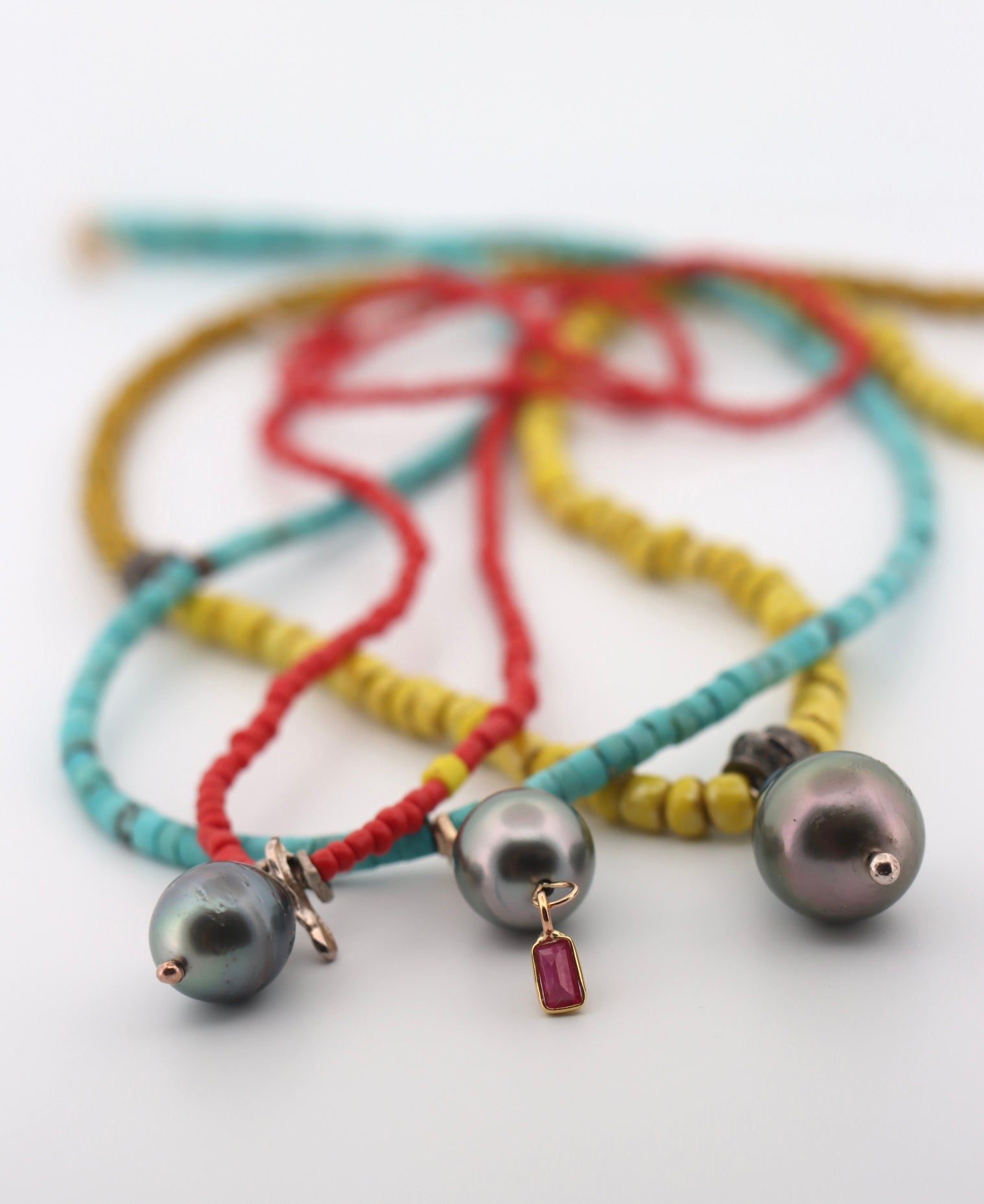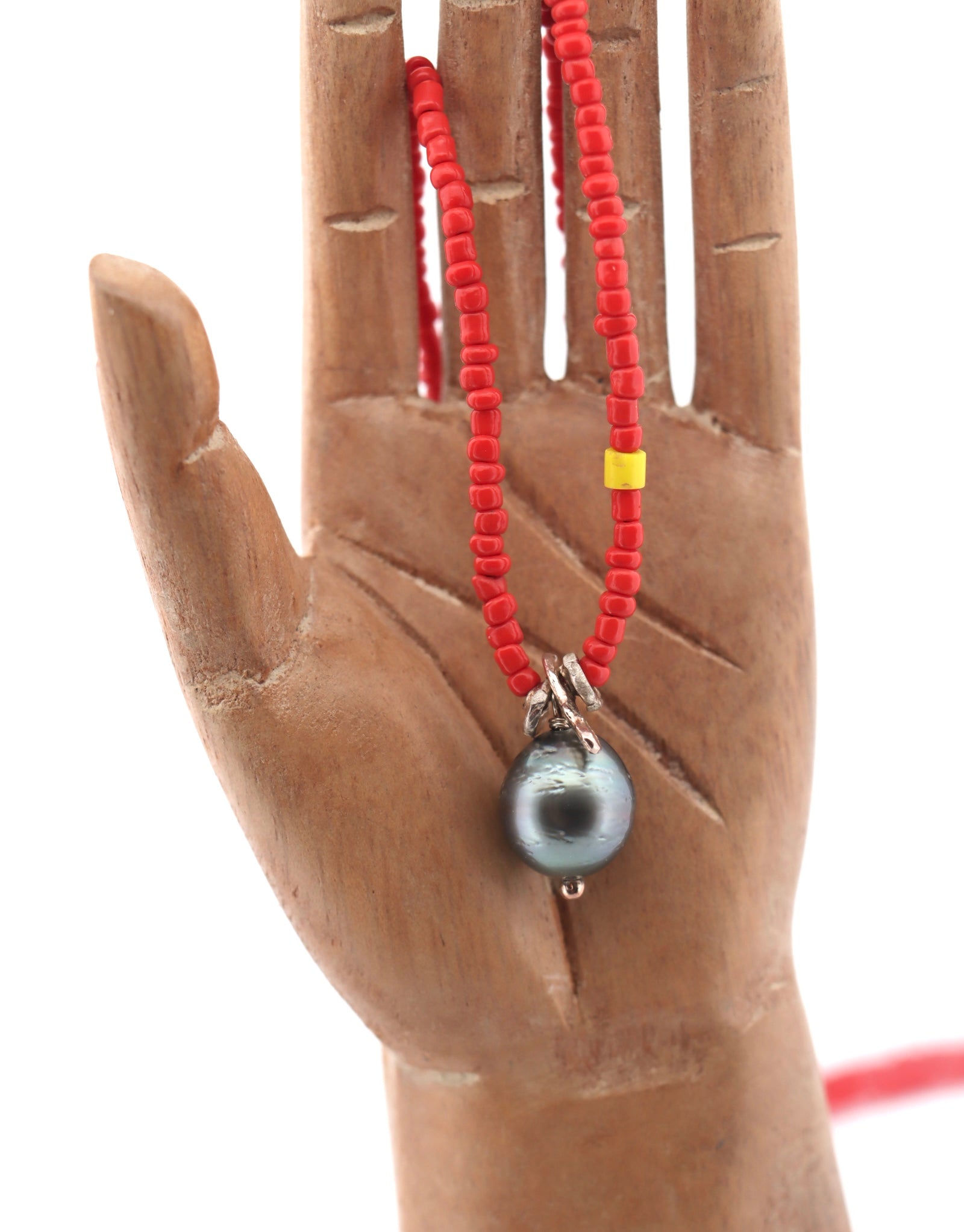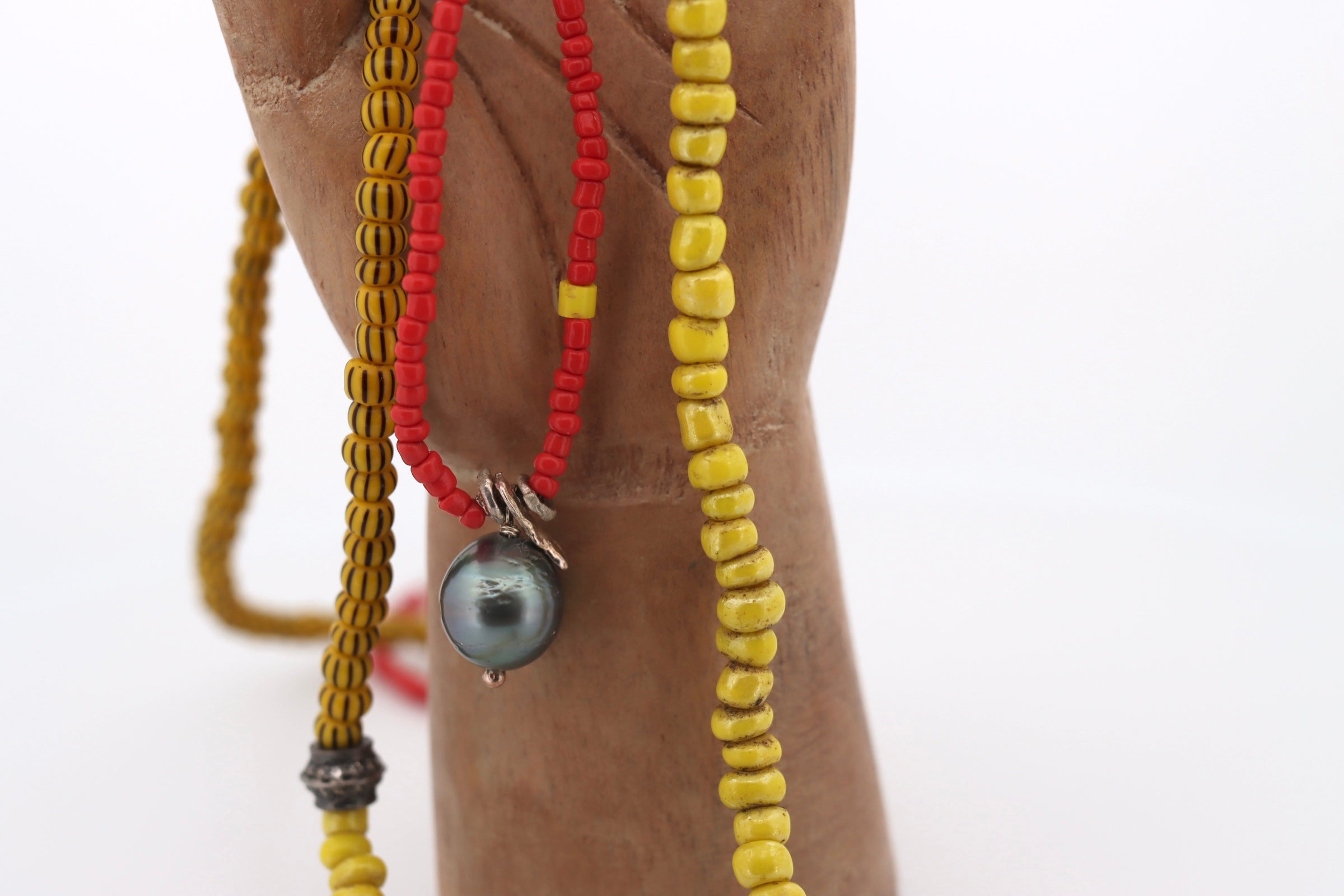 Small red vintage African trade beads with one small yellow bead, Tahitian pearl and hand casted sterling silver beads