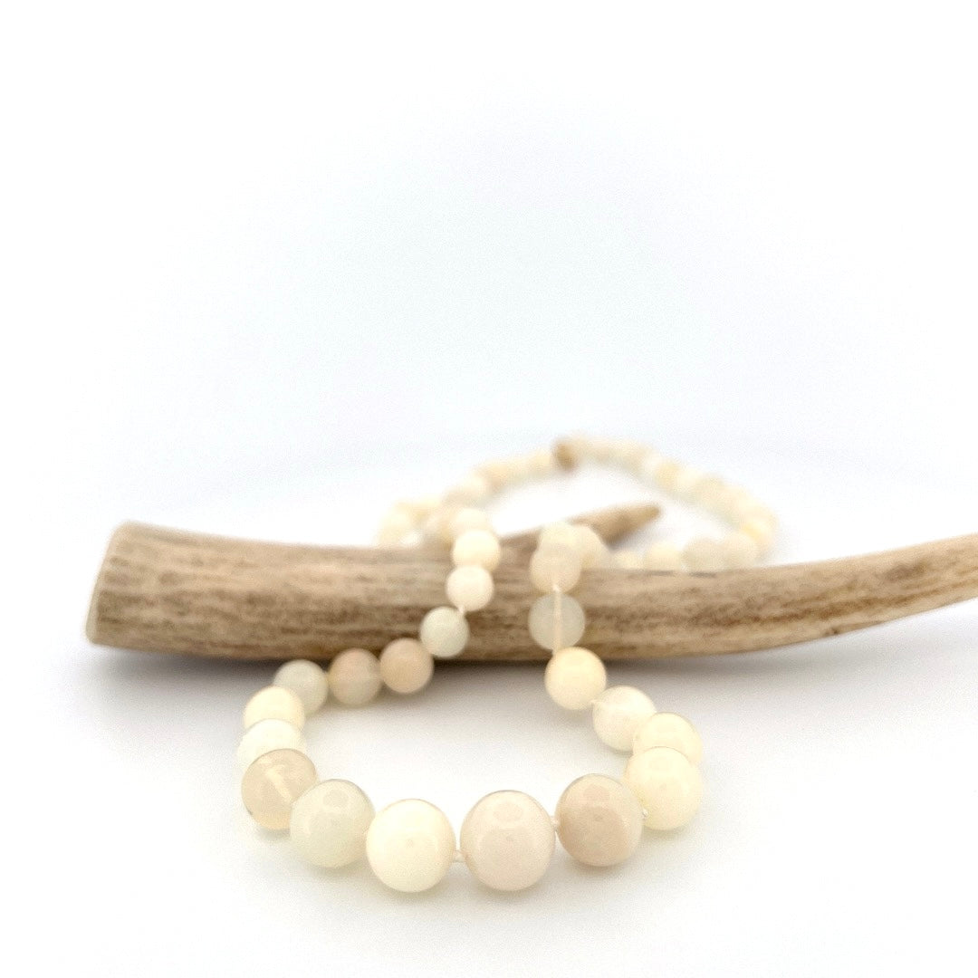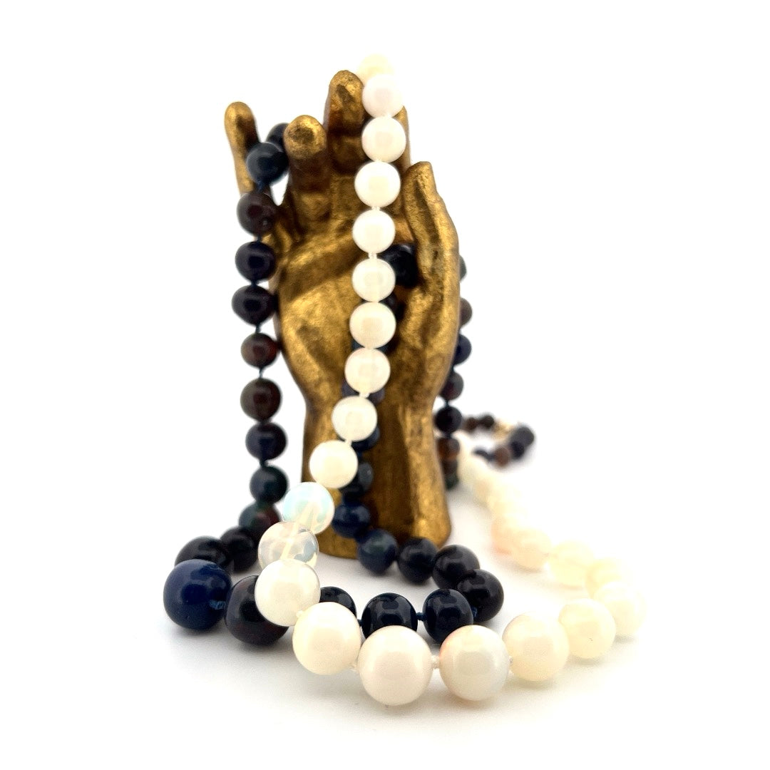 Smooth round white Ethiopian opals hand knotted on while silk with 14k yellow gold clasp