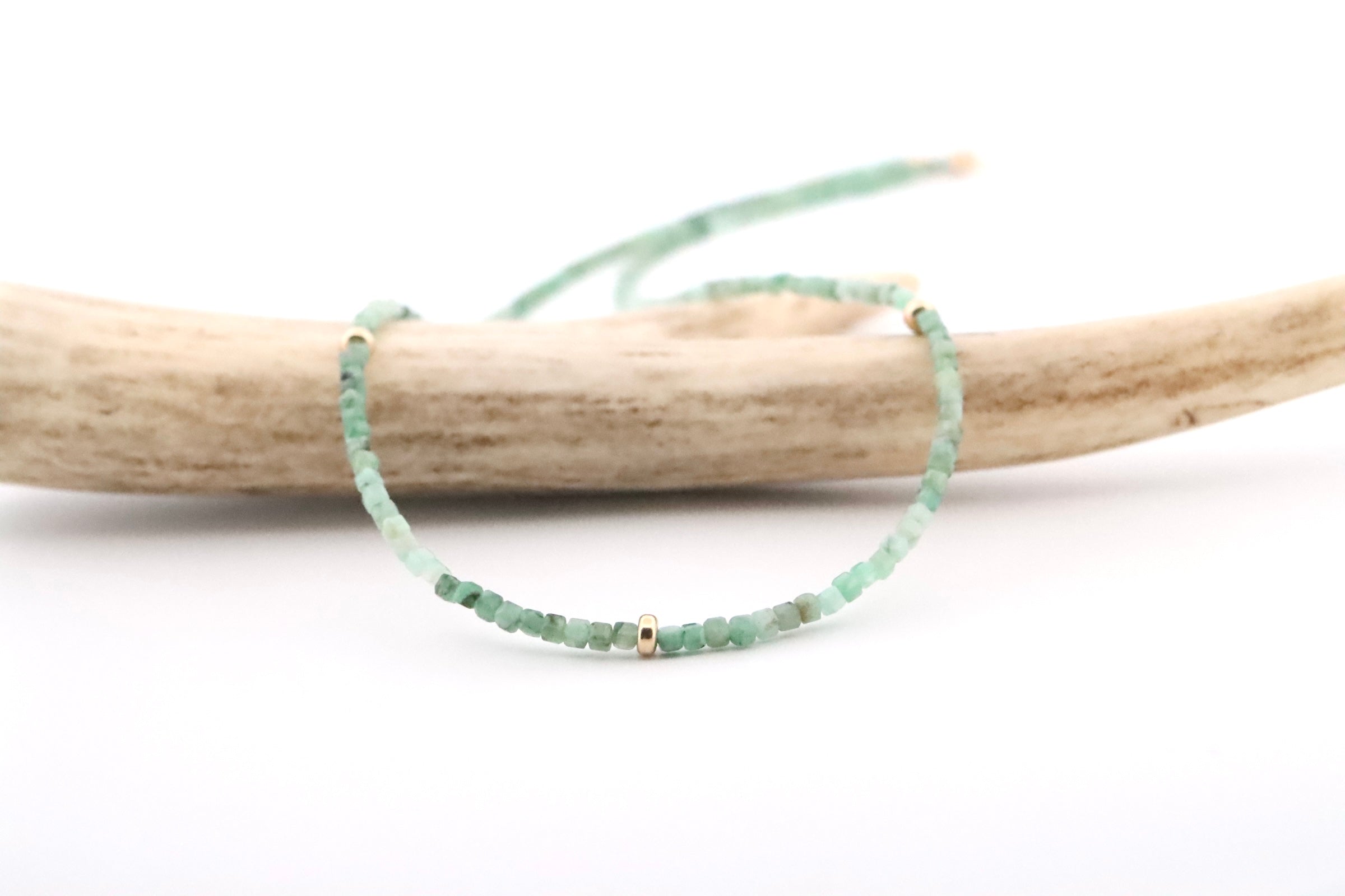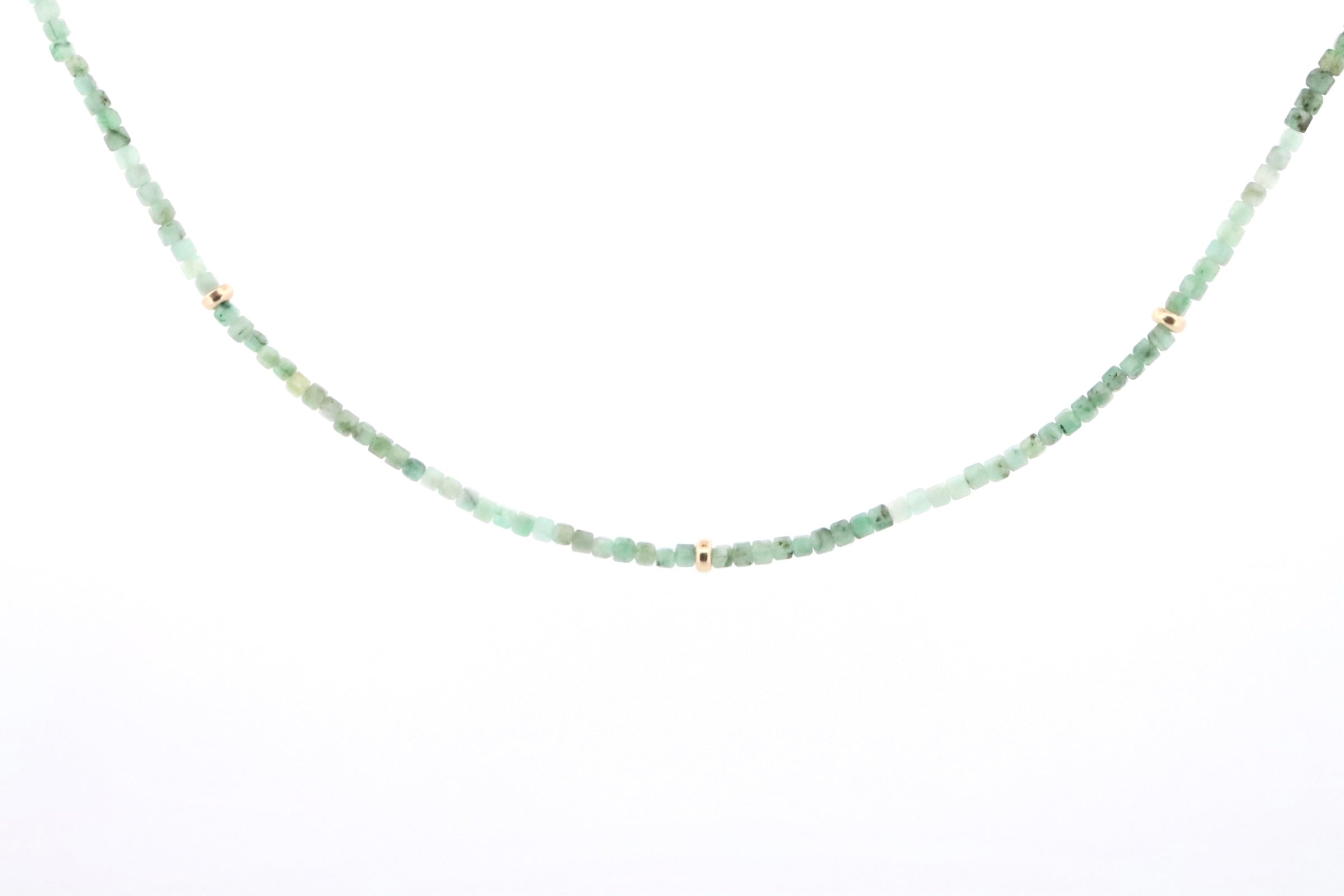 Shaded emerald facetted cube beads with 3 14k yellow gold spacer beads and 14k yellow gold clasp