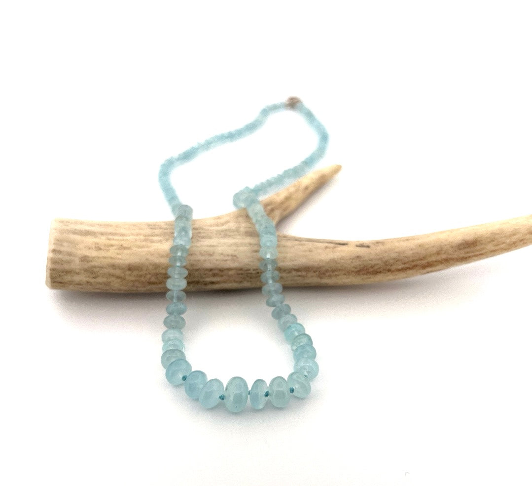 Smooth aquamarine hand knotted on blue silk with sterling silver clasp
