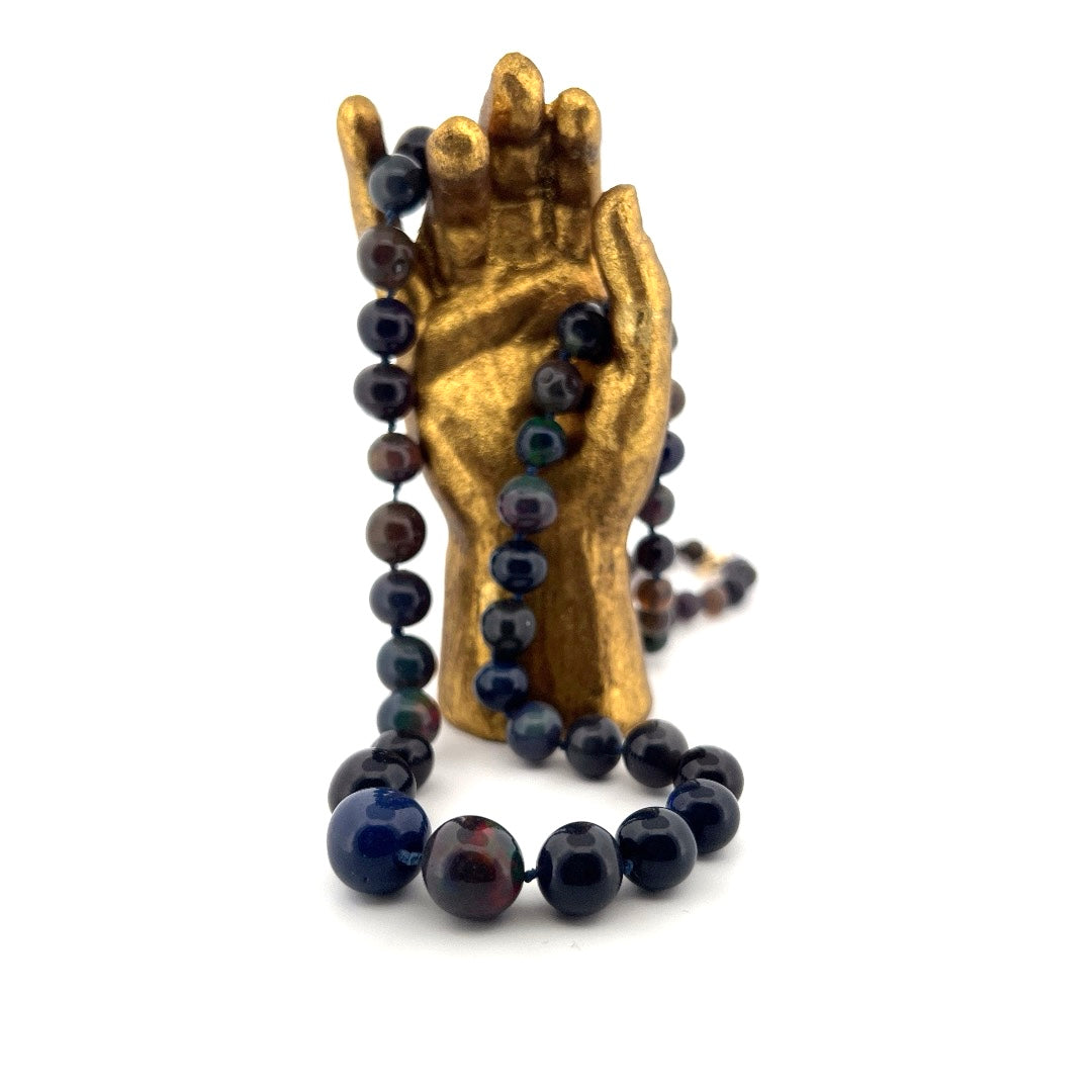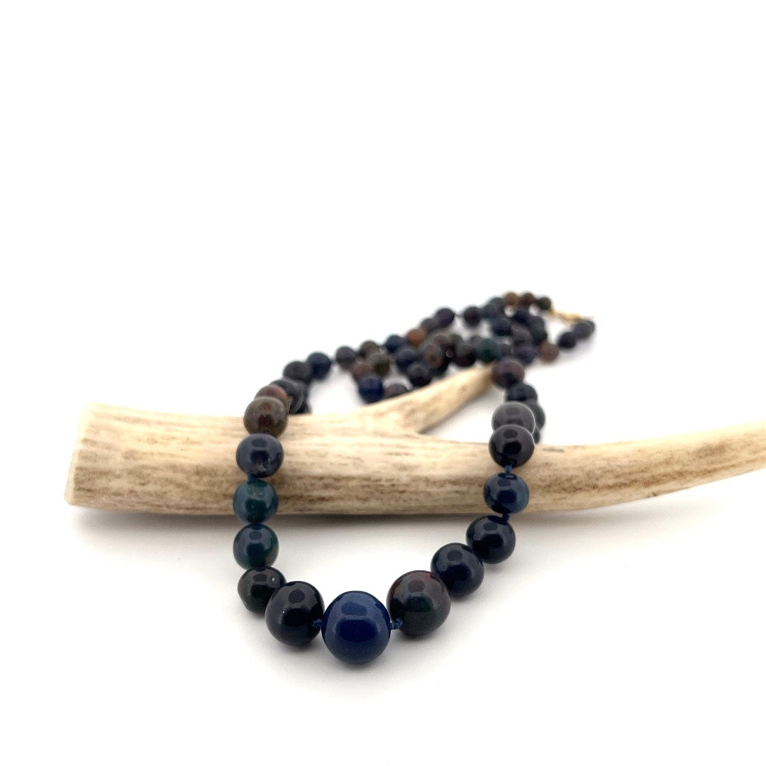 Smooth navy blue opal Ethiopian beads hand knotted on blue silk with 14k yellow gold clasp