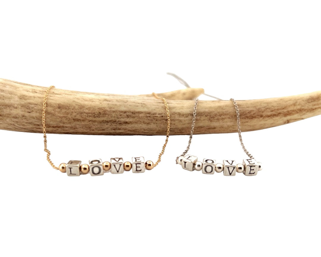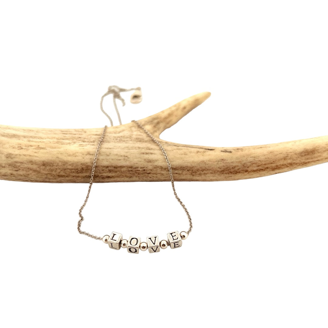 Sterling silver block LOVE letters with round sterling silver beads. Chain and clasp are sterling silver