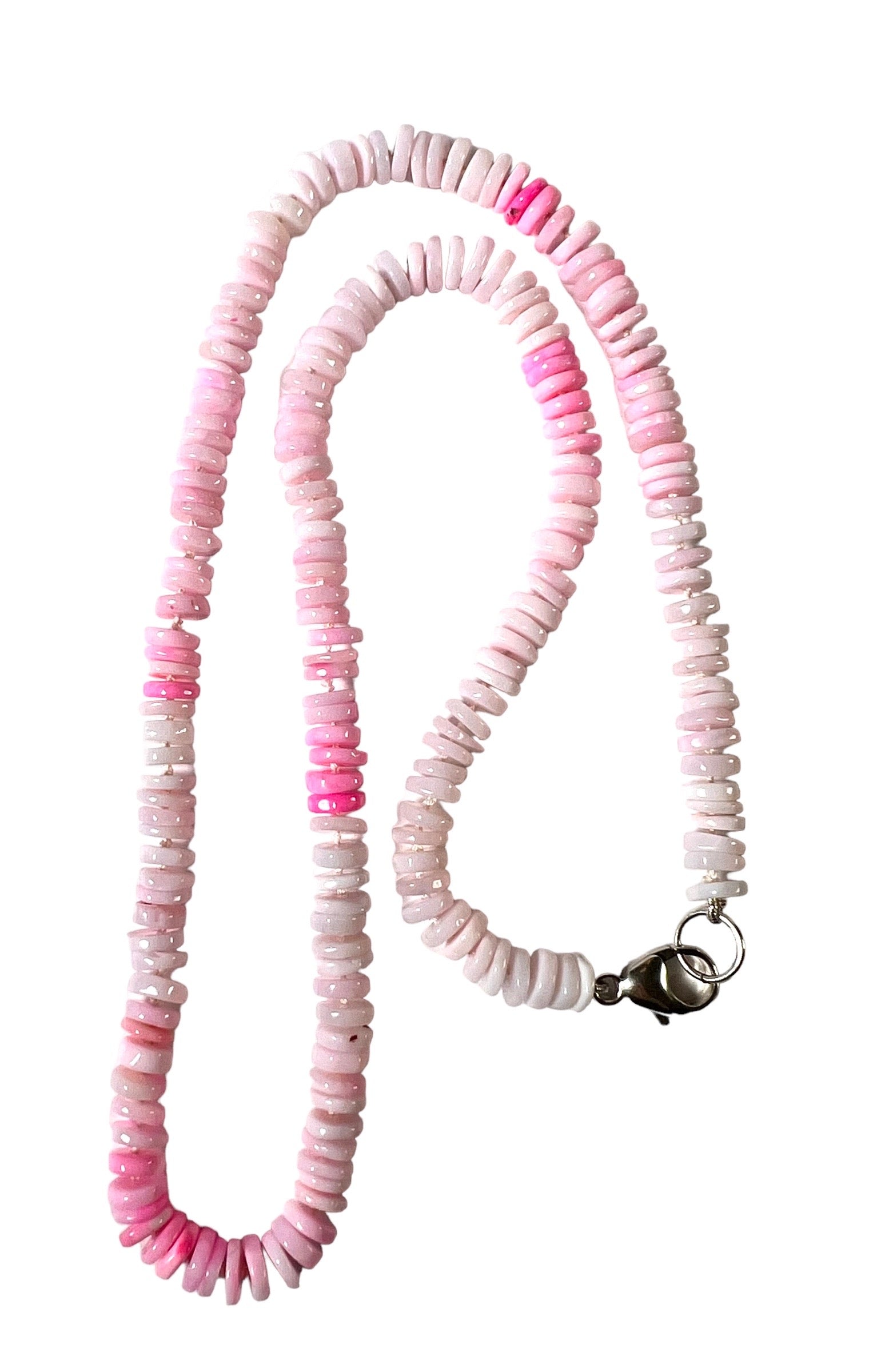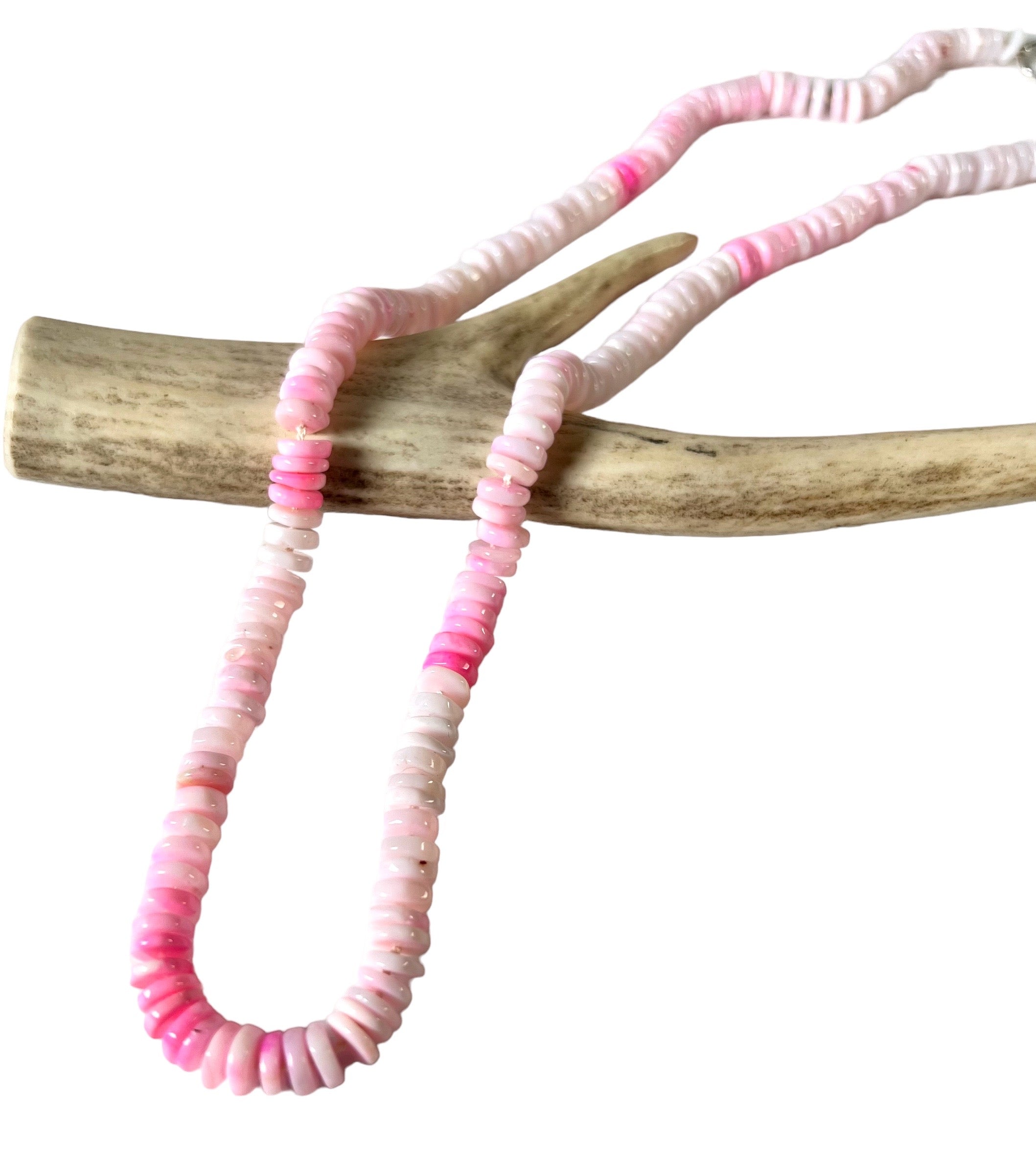Dyed vibrant pink ombre opal heishi necklace hand knotted on silk with sterling silver clasp
