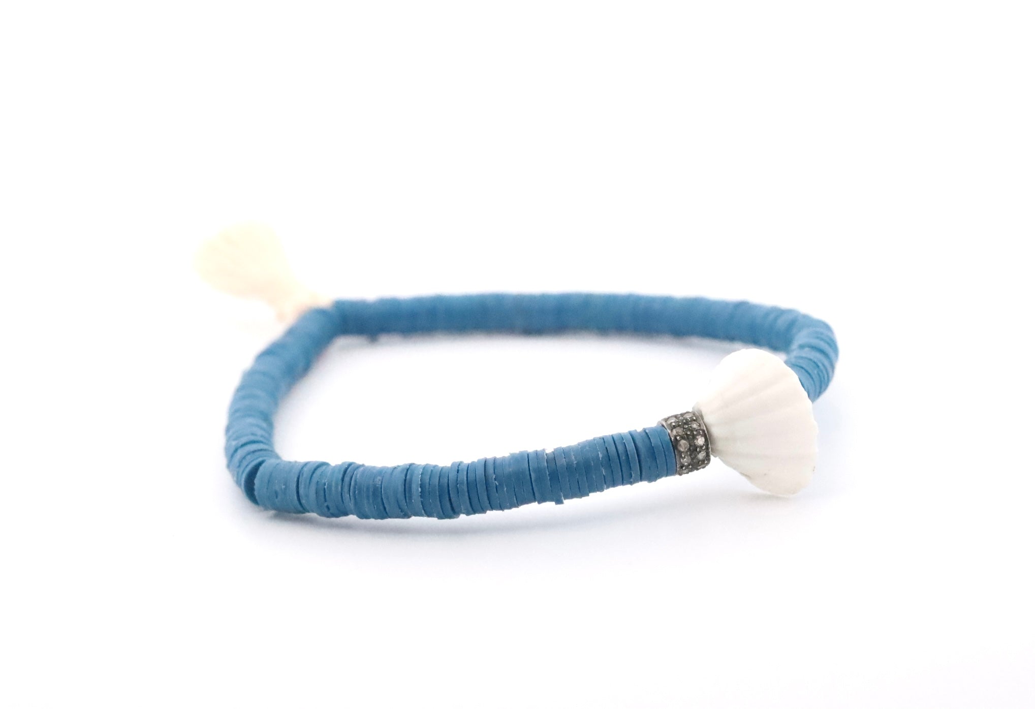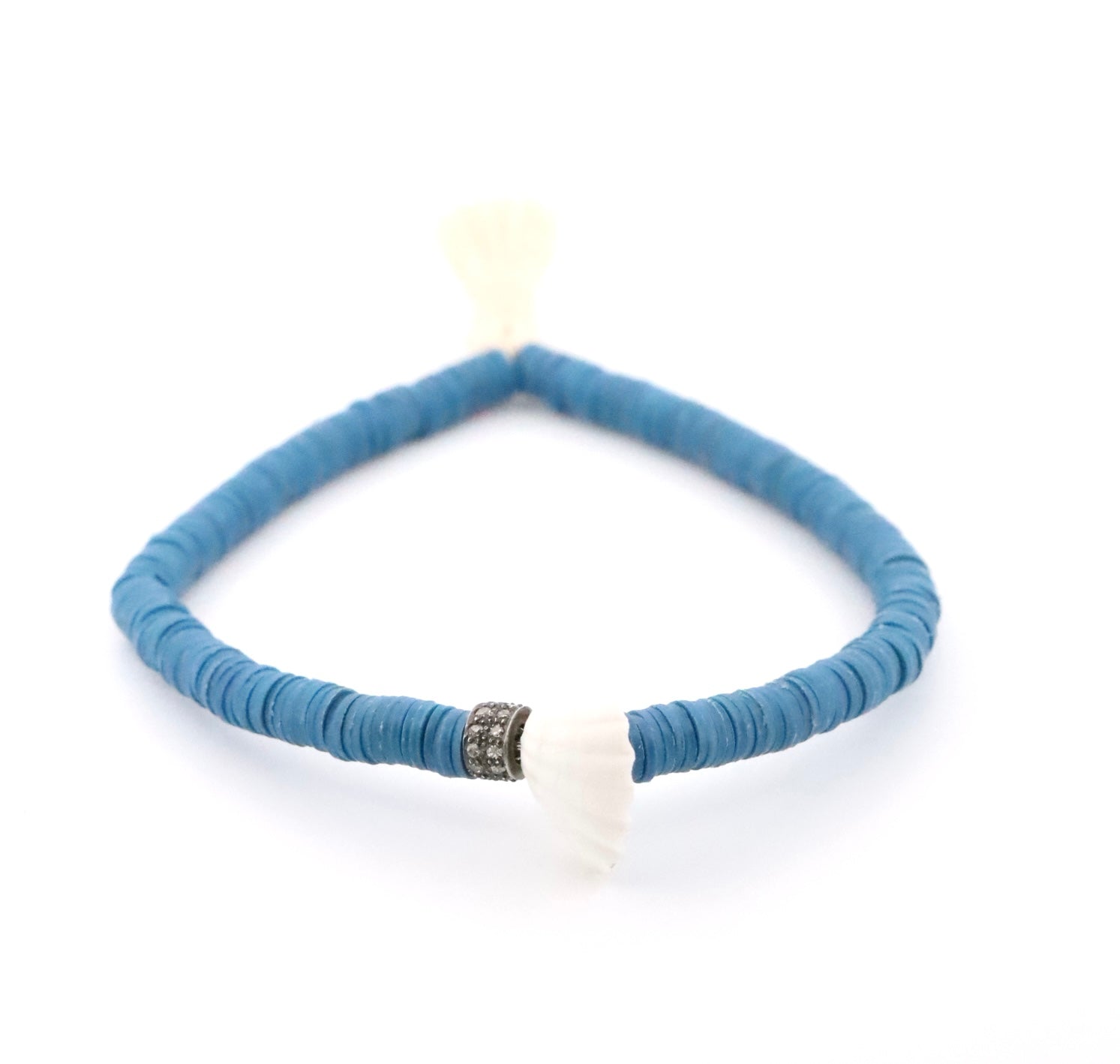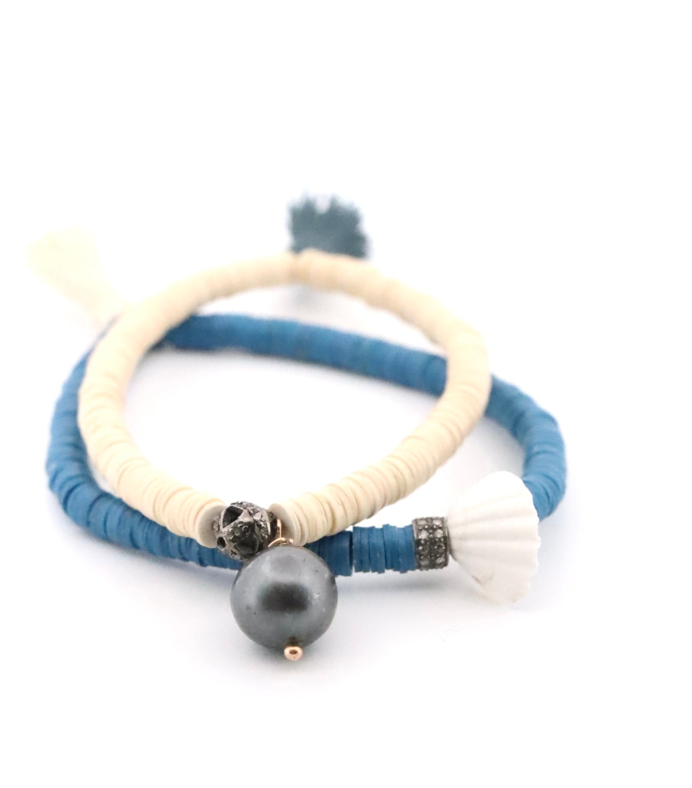 Vintage African vinyl disc beads with vintage African shell and oxidized sterling silver double diamond row spacer bead. Silk cream tassel. Strung on stretchy elastic.