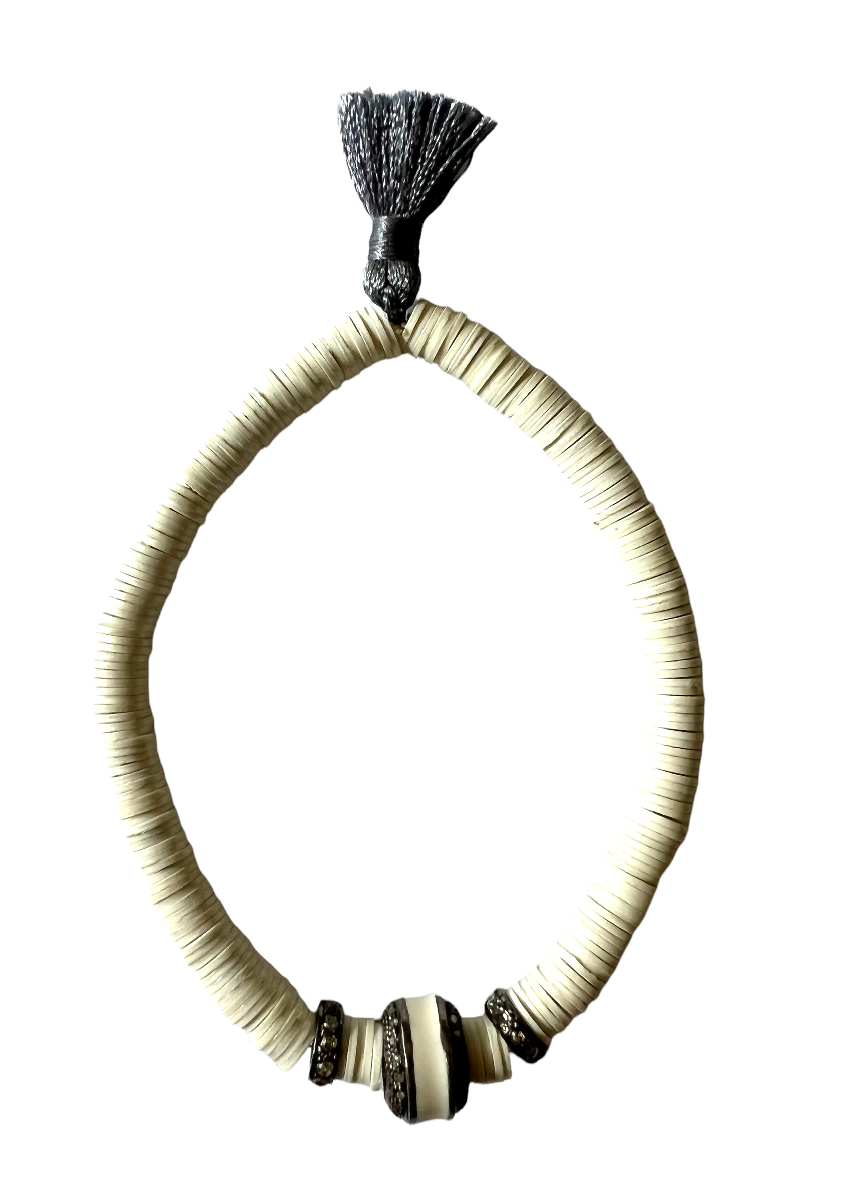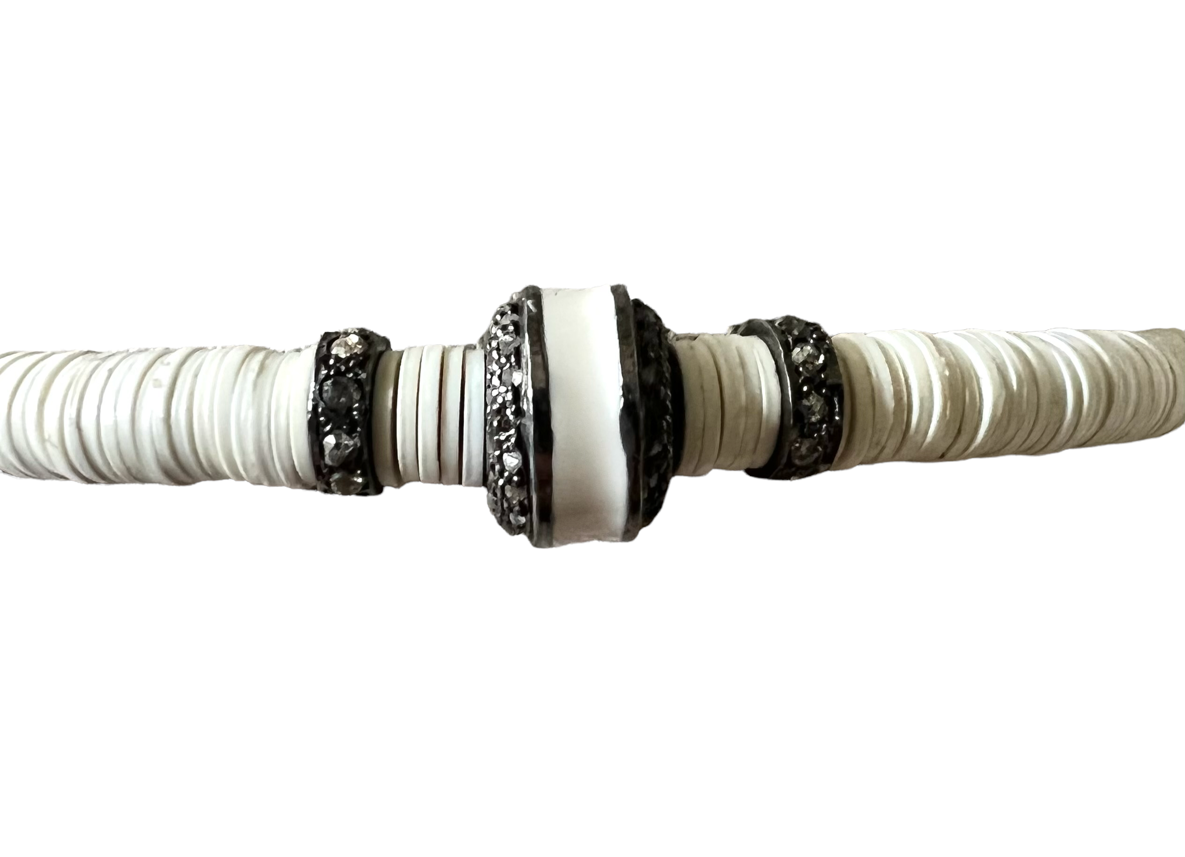 Off white vintage vinyl beads with oxidized sterling silver and diamond beads. Center bead is white enamel & diamonds.