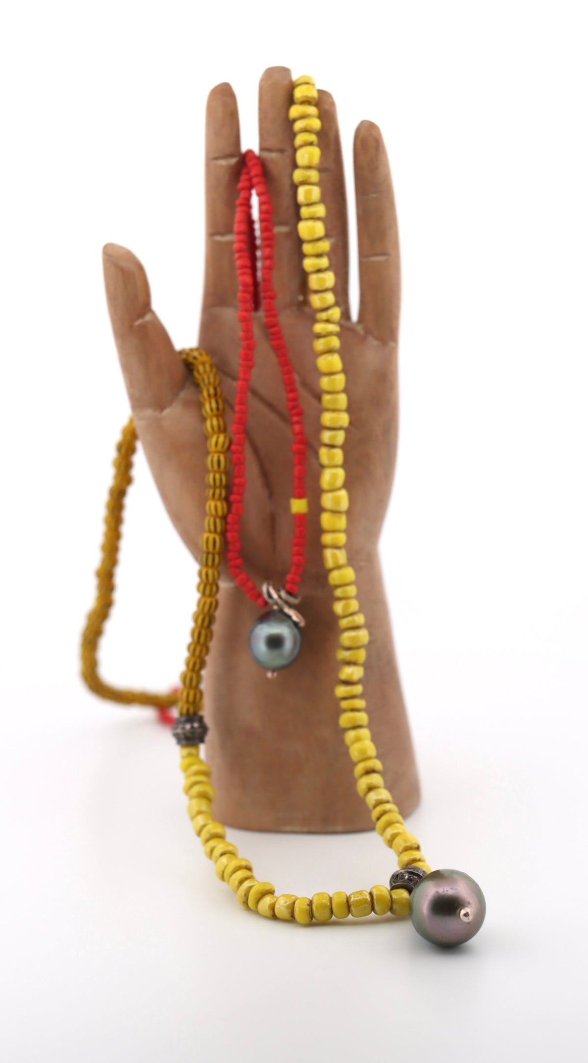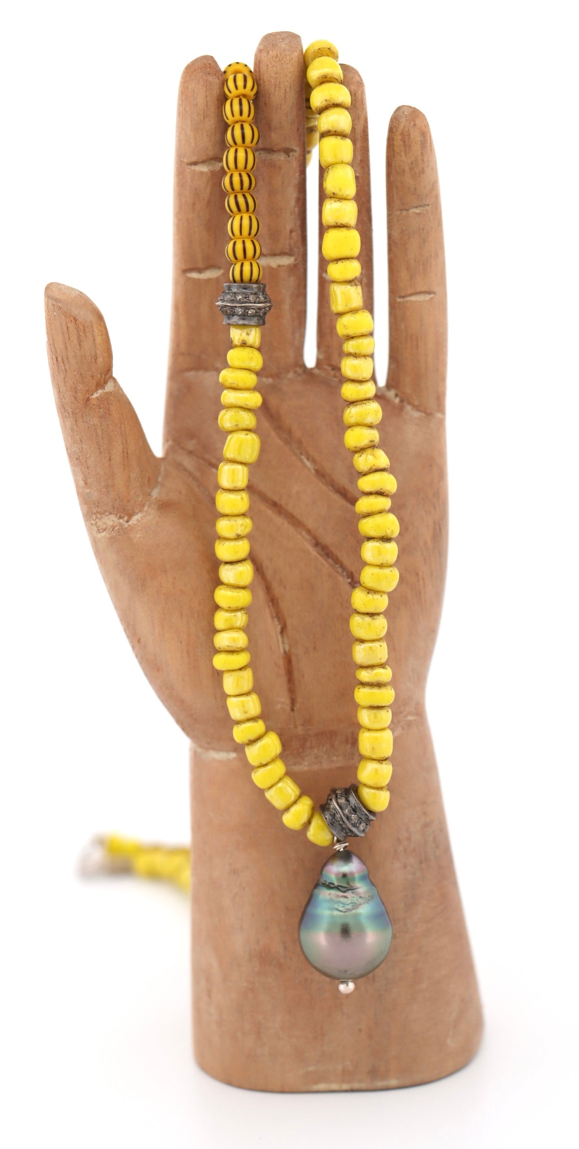 Vintage yellow African trade beads with Tahitian pearl, oxidized sterling silver pave diamond spacer beads and sterling silver clasp