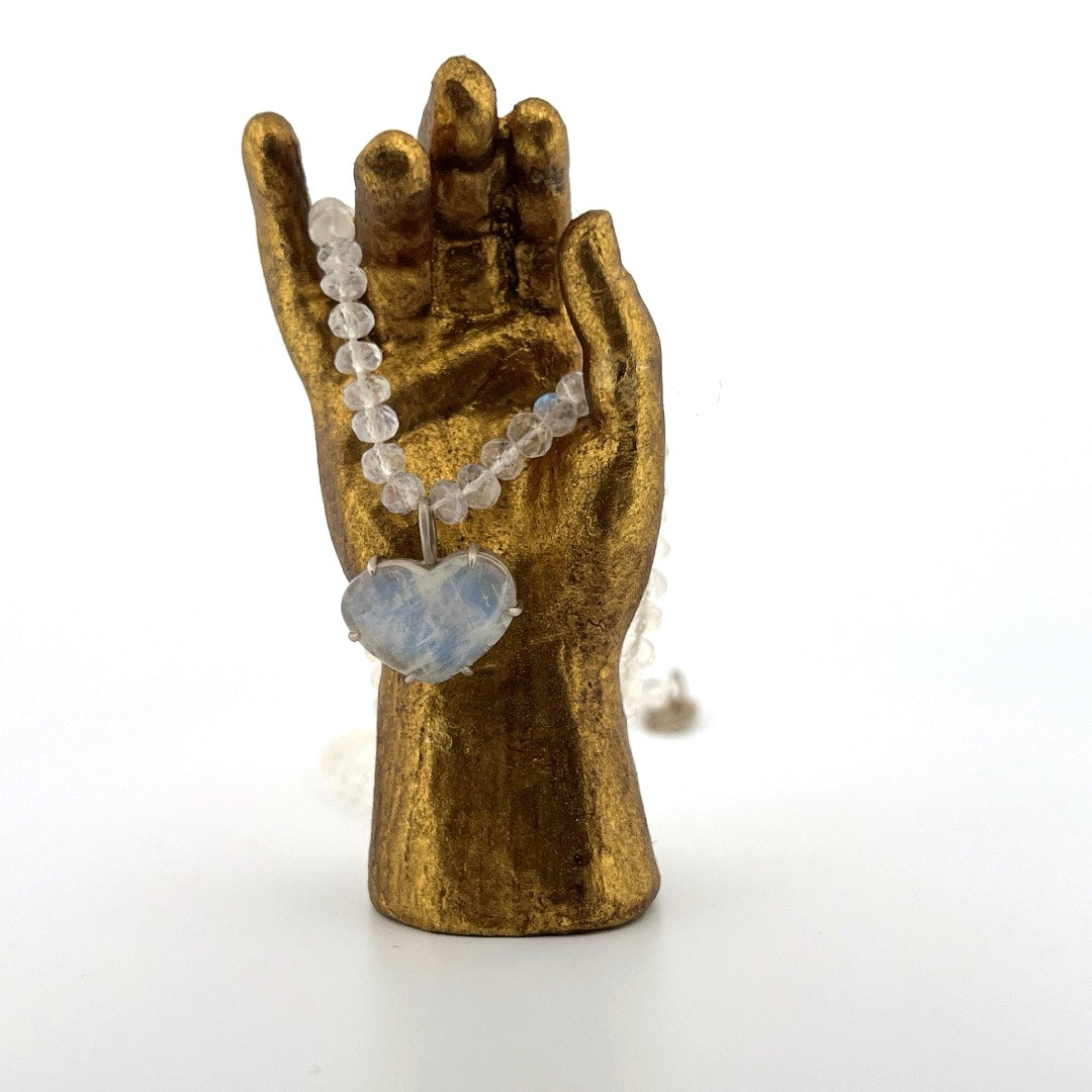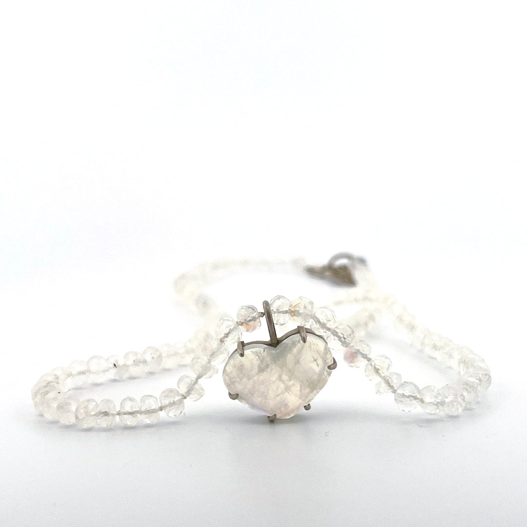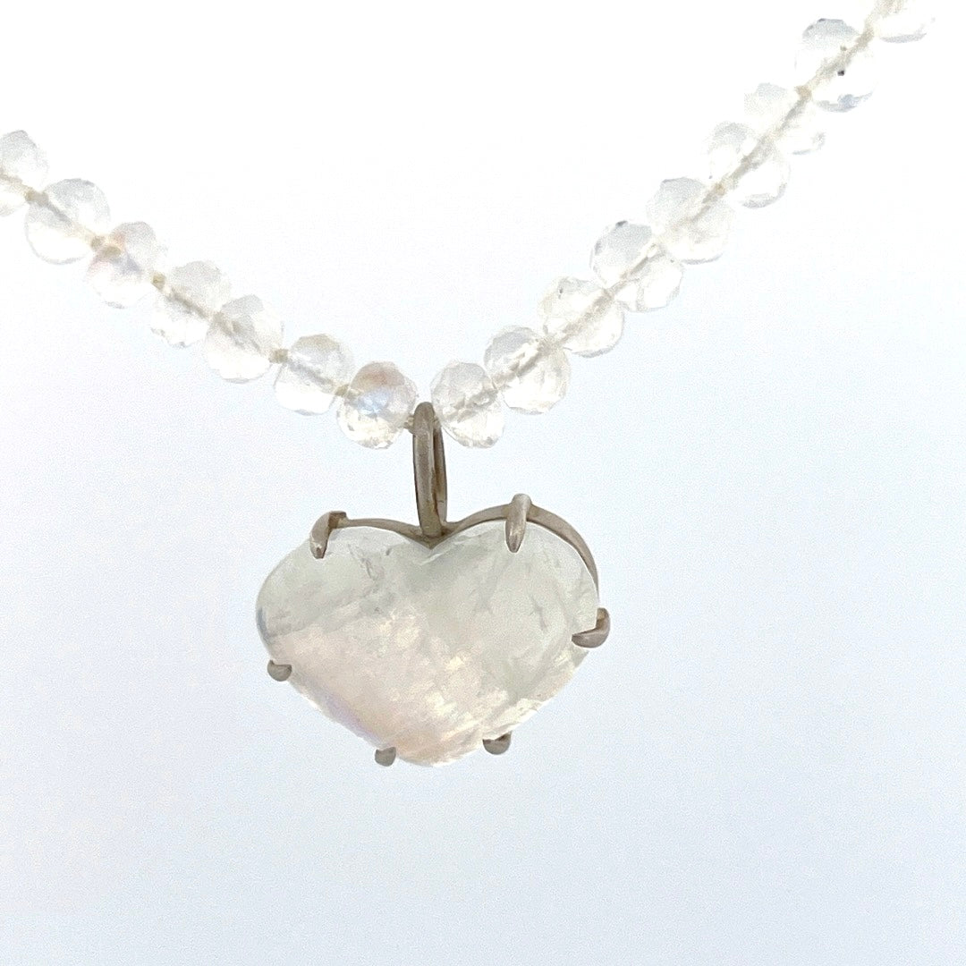 Faceted white moonstone beads hand knotted on white silk with hand cut moon stone heart prong set charm pendant