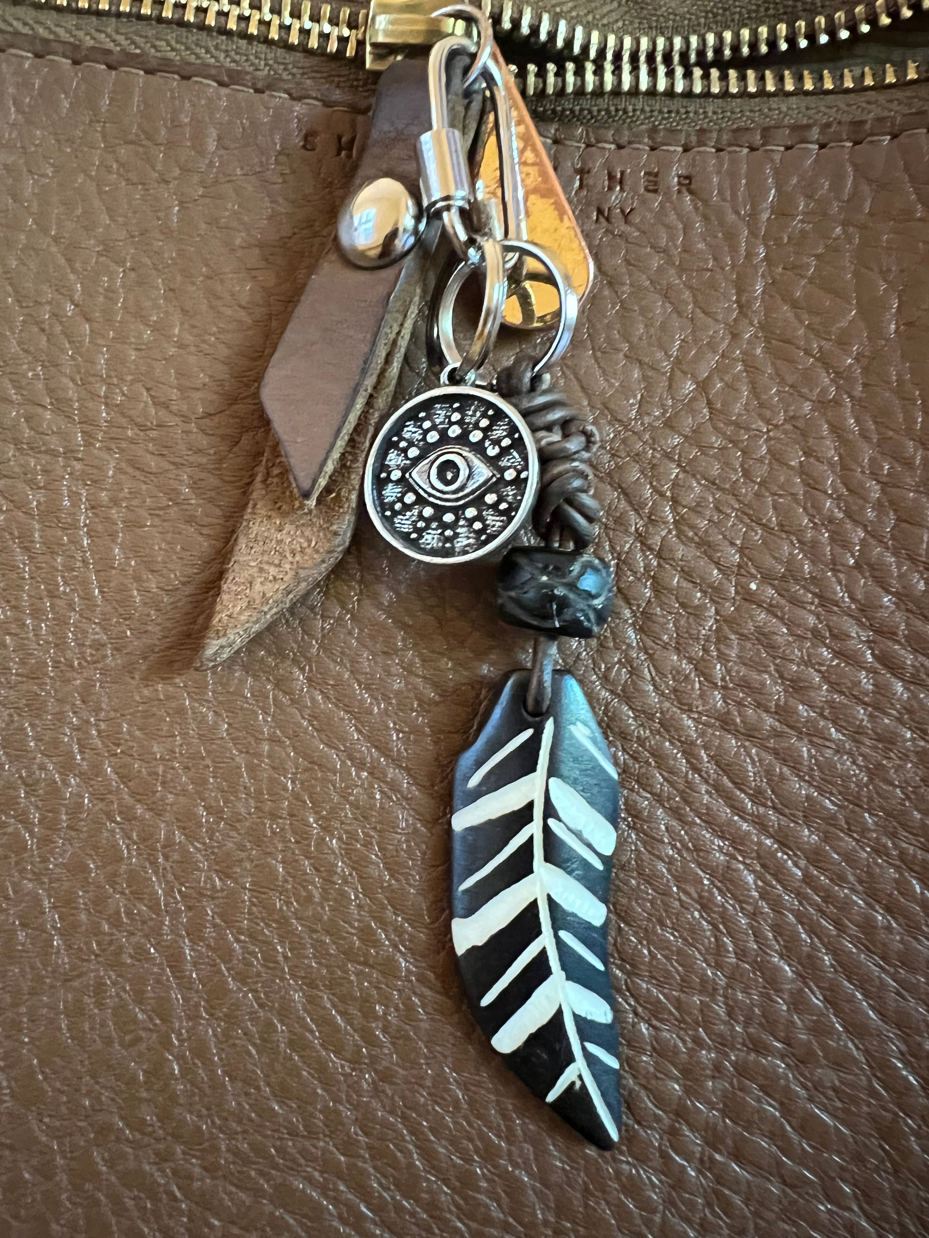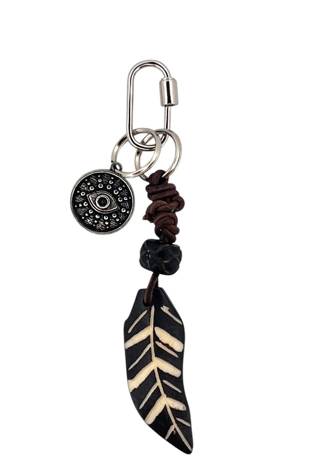 Carved wooden feather on leather & silver Britannium eye disc on silver carabiner clip